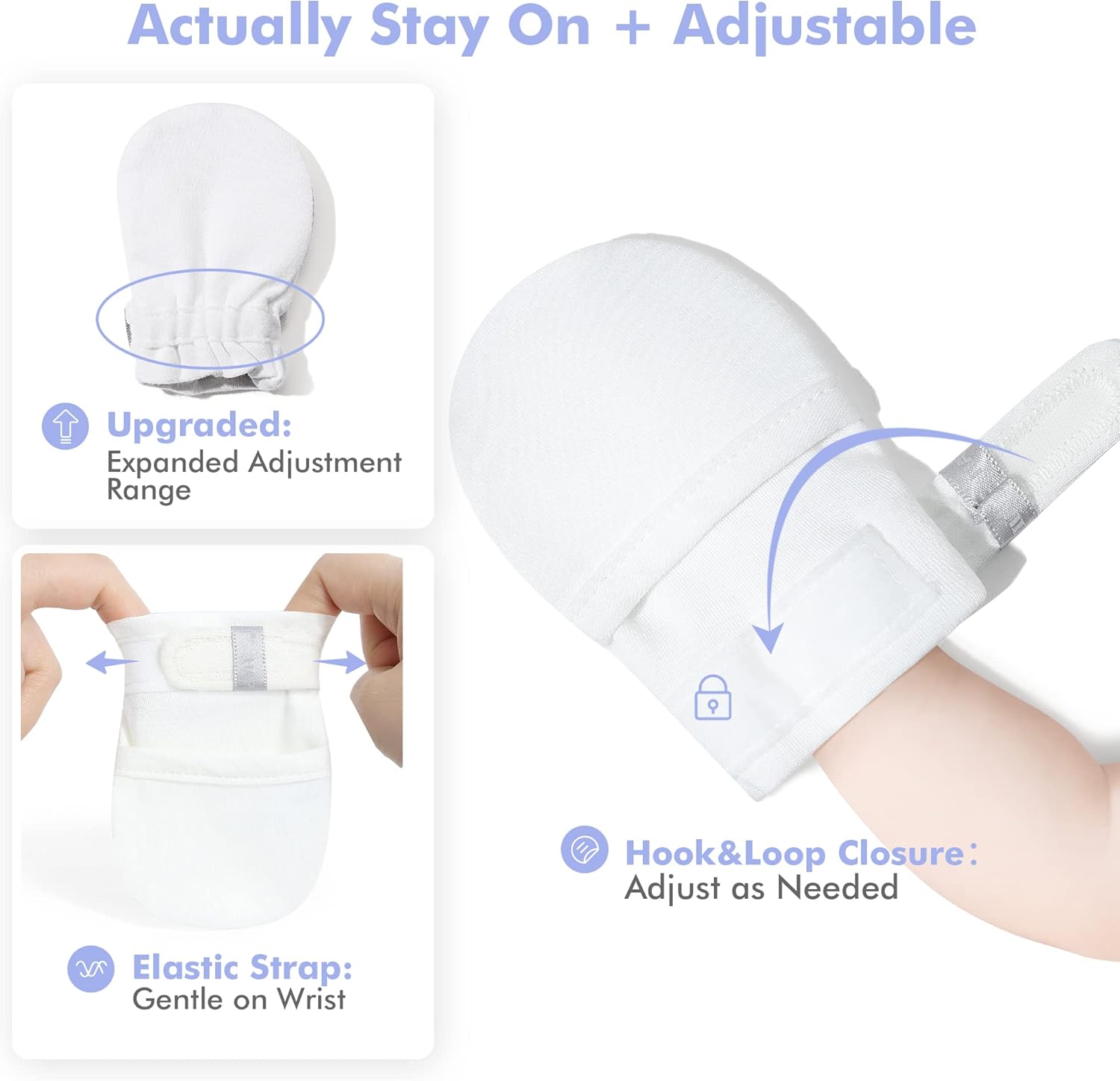 - [No Scratch: Keep Baby Safe]: These Anti Scratch Baby Mittens are designed to prevent harmful scratches & thumb sucking, also a big help with things such as Eczema, Dry Itchy Skin, Pulling hair, NG Feeding Tube and Squeezing during Breastfeeding