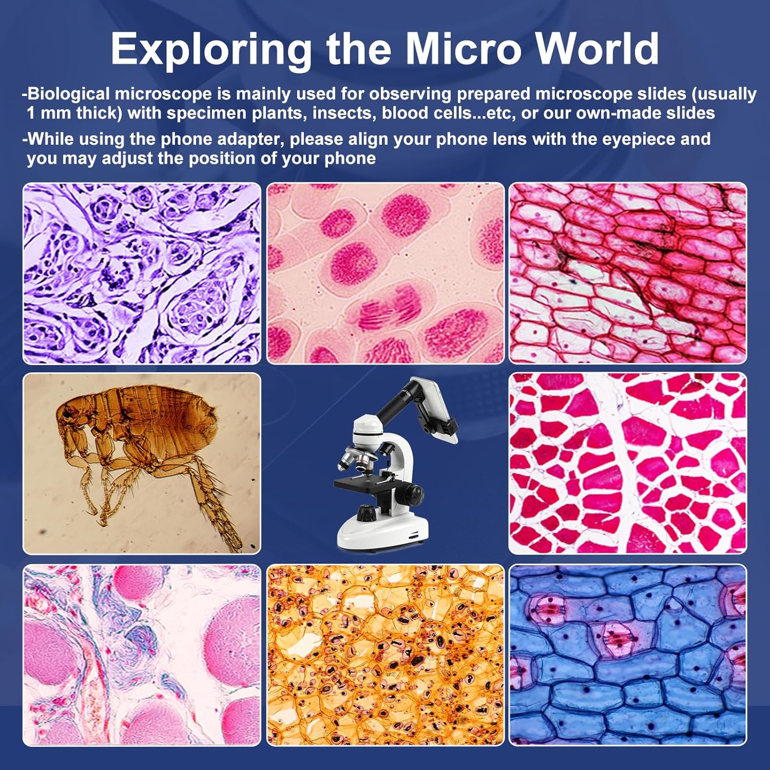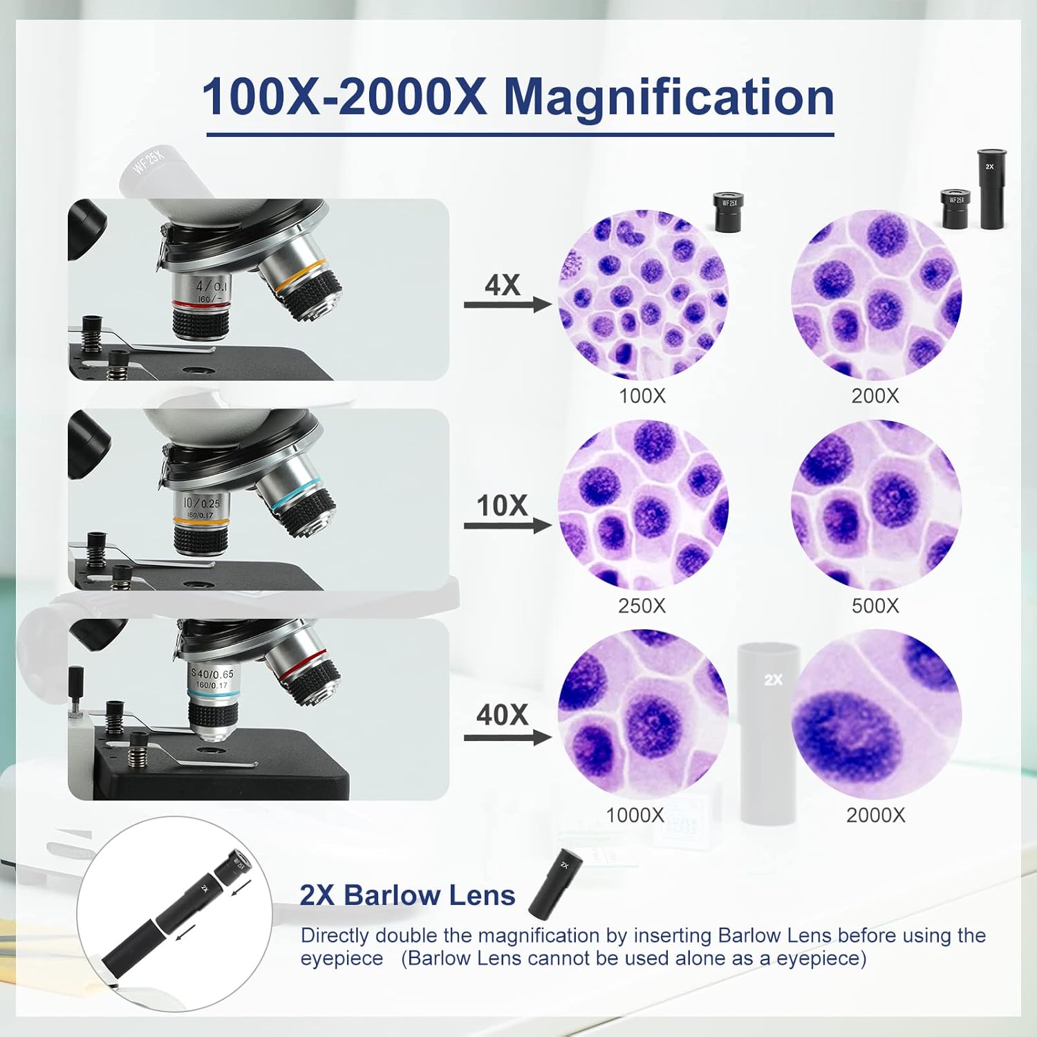 - 100X-2000X High Magnification: Wide field Eyepiece WF25X and 2X Barlow lens work with 3 metal achromatic objective lenses: 4X 10X 40X, providing 6 levels magnifications: 100X 250X 1000X/200X 500X 2000X