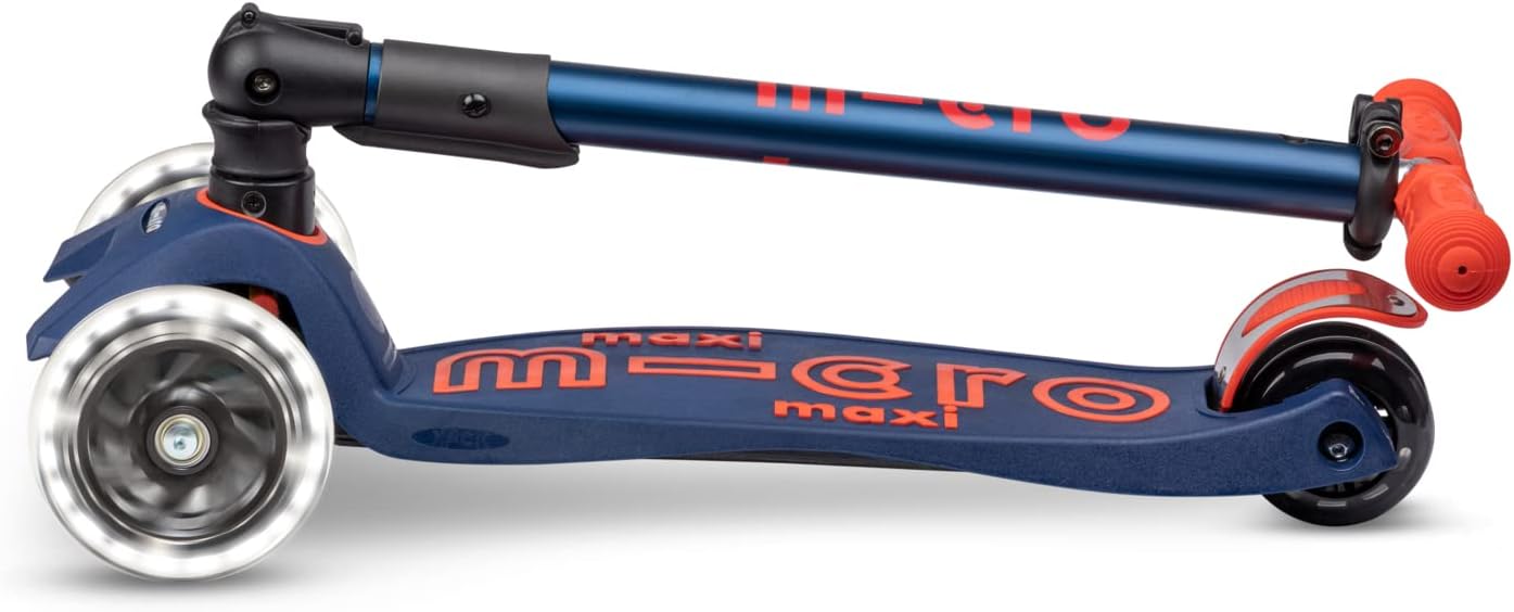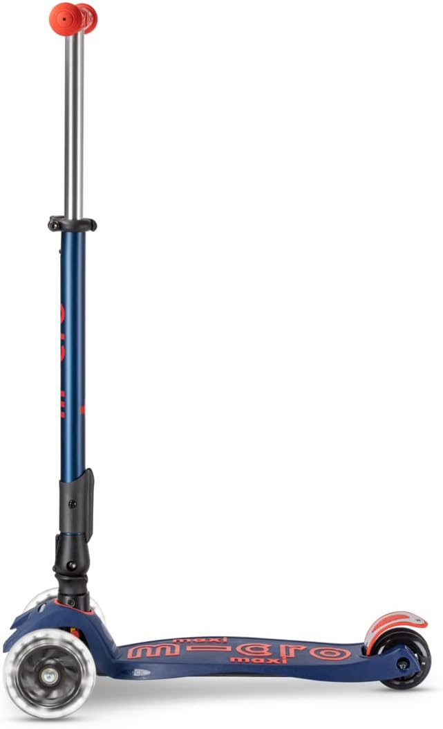 - Micro's newly upgraded Maxi Deluxe Foldable LED features motion-activated light-up front wheels and a foldable T-bar for easy carrying & travel. Created with a lean-to-steer design, offering a stable ride that supports children as they curve and carve the sidewalk.