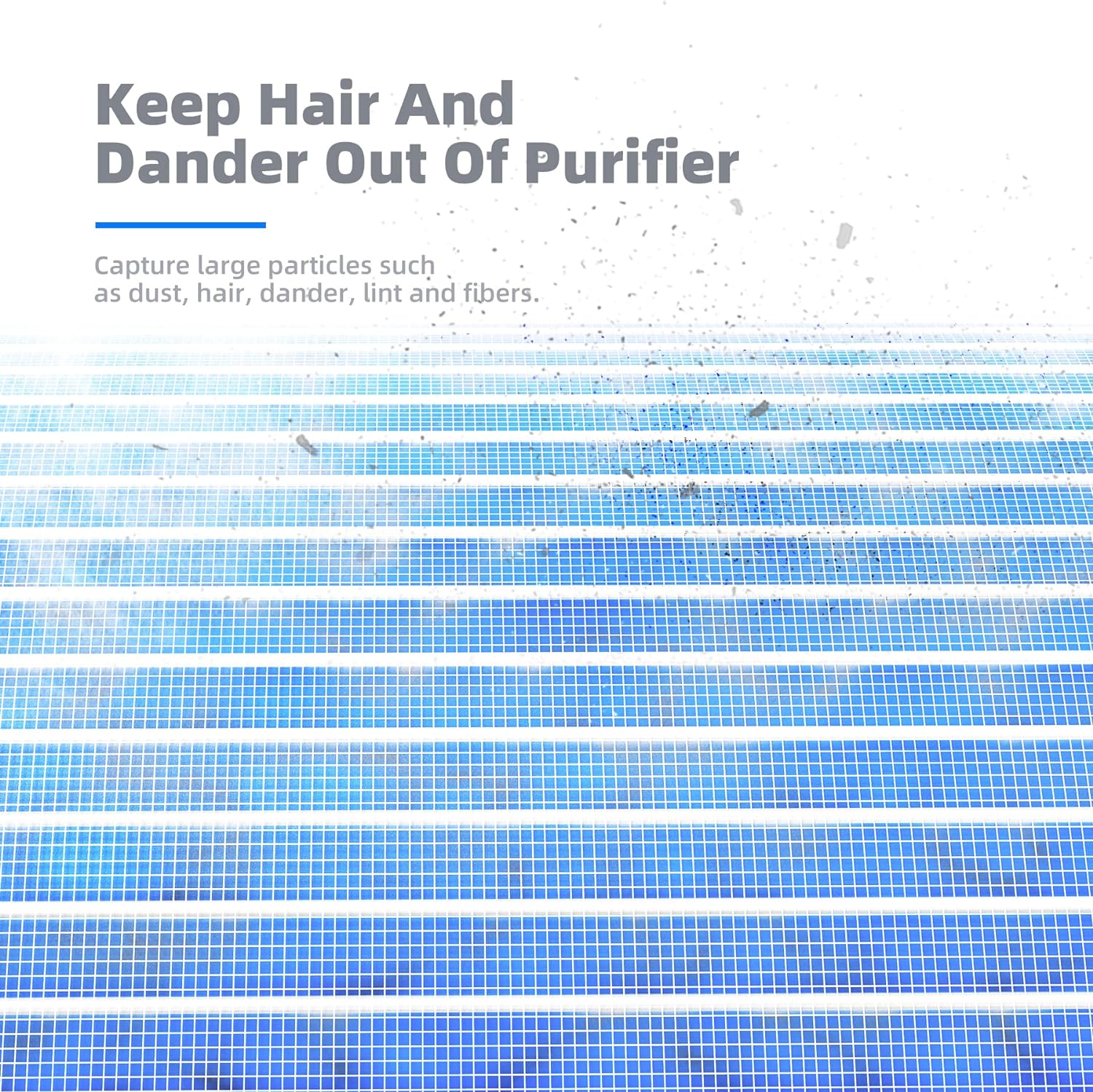 - Prevent Clogging: When hairs, dander, and other large particles meet the pre-filter layer, they will be captured them and keep it outside to prevent the air purifier from clogging.