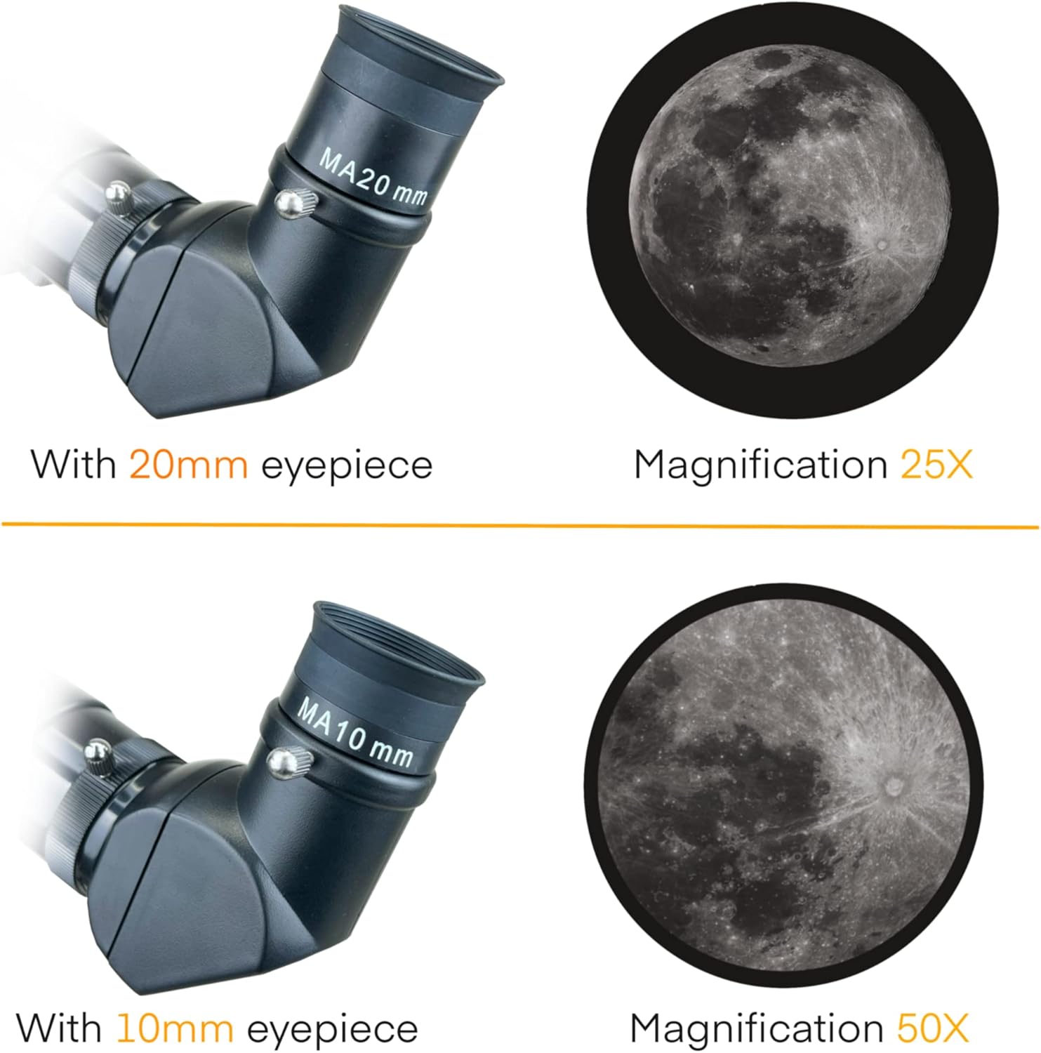 - 【Accessories】This beginner telescope is equipped with all the essentials for embarking on your deep exploration journey. This telescope for beginners included with two highly transmissive glass eyepieces, 10mm and 20mm, ensuring crisp and sharp image unmatched by other telescopes. Capture stunning images of the night sky on the go with ease using the included smartphone adapter, transforming this telescope into a smarphone telescope. Plus, With the included astonishing 3X Barlow Lens, the maximum magnifiation of this telescope can reach 120X, revealing intricate details like you were an astronaunt.