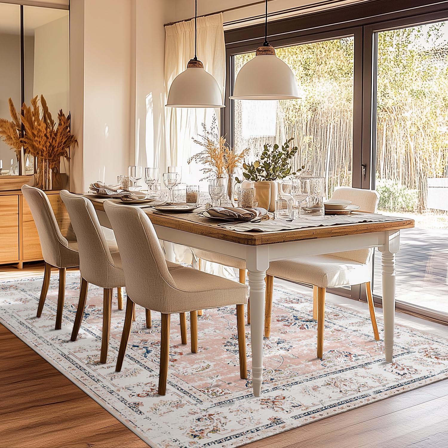 jinchan 6x9 Area Rugs for Living Room - Machine Washable Vintage Floral Distressed Design Stain Resistant Boho Carpet Ultra-Thin Low Pile Non-Slip for Bedroom Dining Room Office (6‘x9',Pink)