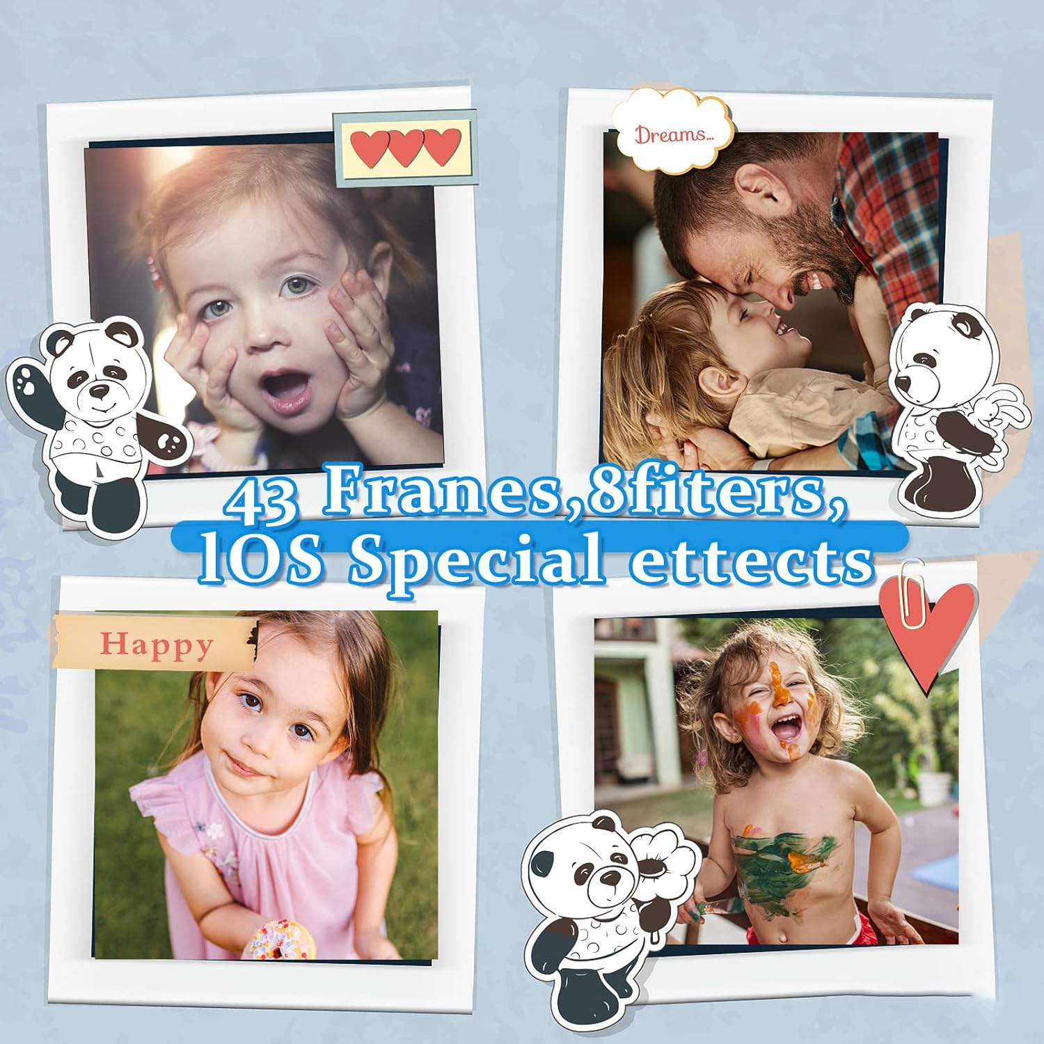 - 【Multi-functions】The kids camera comes with 43 Frames,8 filters,10 Special effects, has autofocus shooting, self-timer and time-lapse shooting, The automatic shutdown function can be selected in 2 seconds, 5 seconds,10 seconds,photos can be magnified 1-4 times, expandable storage capacity up to 32GB( the package within 32GB Micro SD card) - Bulit in 5 games,This not only a toy camera but a real camera to arouse child's creativity and hobby.