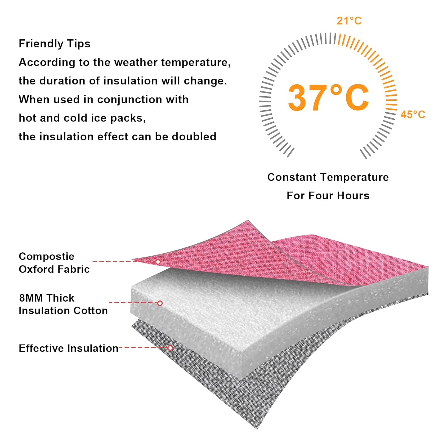 - HIGH QUALITY MATERIALS: Made of high quality water-resistant composite oxford fabric, 8mm extra-thick EPE foam and food-grade aluminum foil liner. No odor, non-toxic, food safe, durable, lightweight. Effectively keep bottles stay cold, warm or fresh for hours, it keeps breast milk fresh.