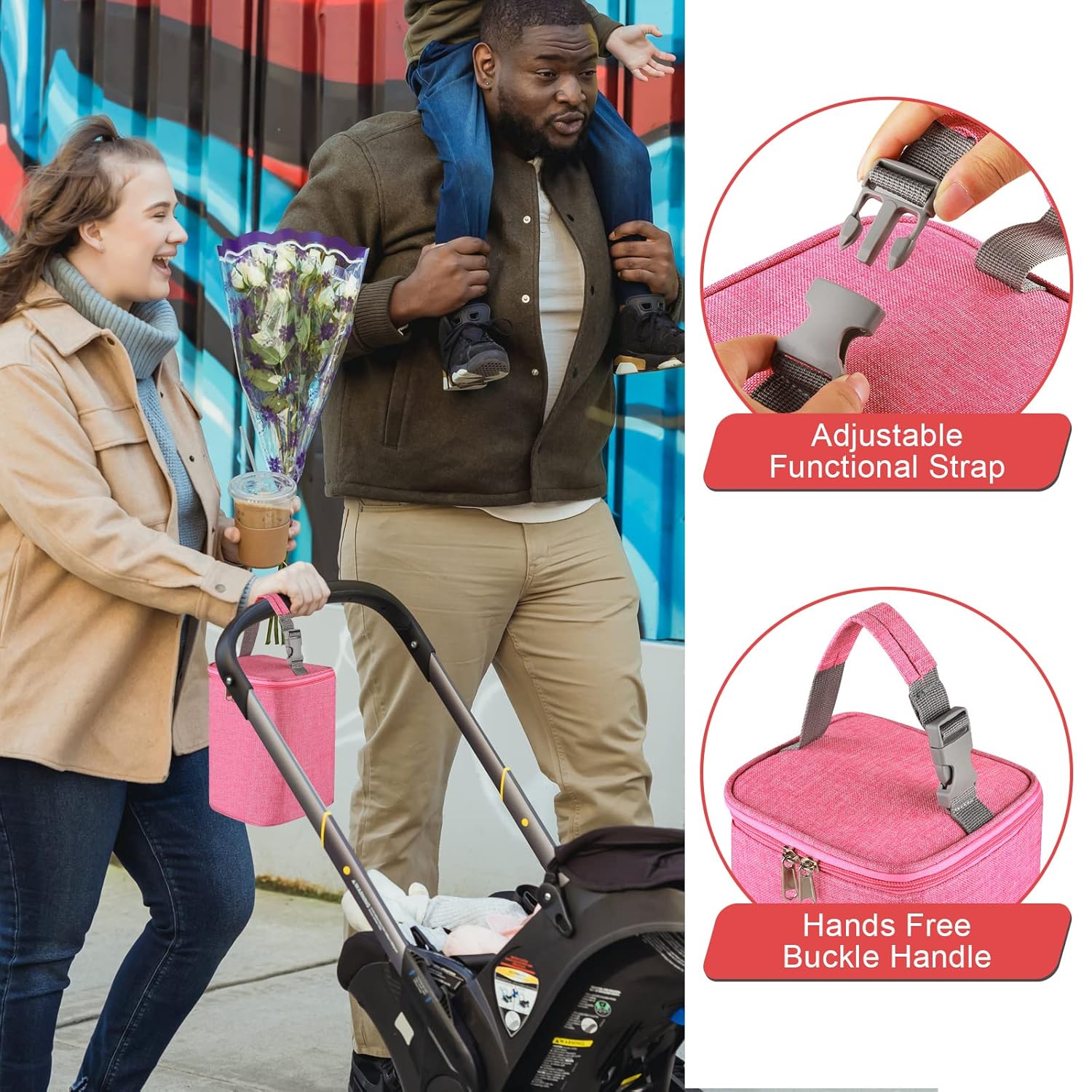 - PORTABLE WITH DETACHABLE BUCKLE: The detachable buckle design of the reusable baby bottle bag ensures you two portable carry ways, handhold or hanging on a stroller, together with soft nylon handle, let you carry the bottle bag effortlessly and comfortably.