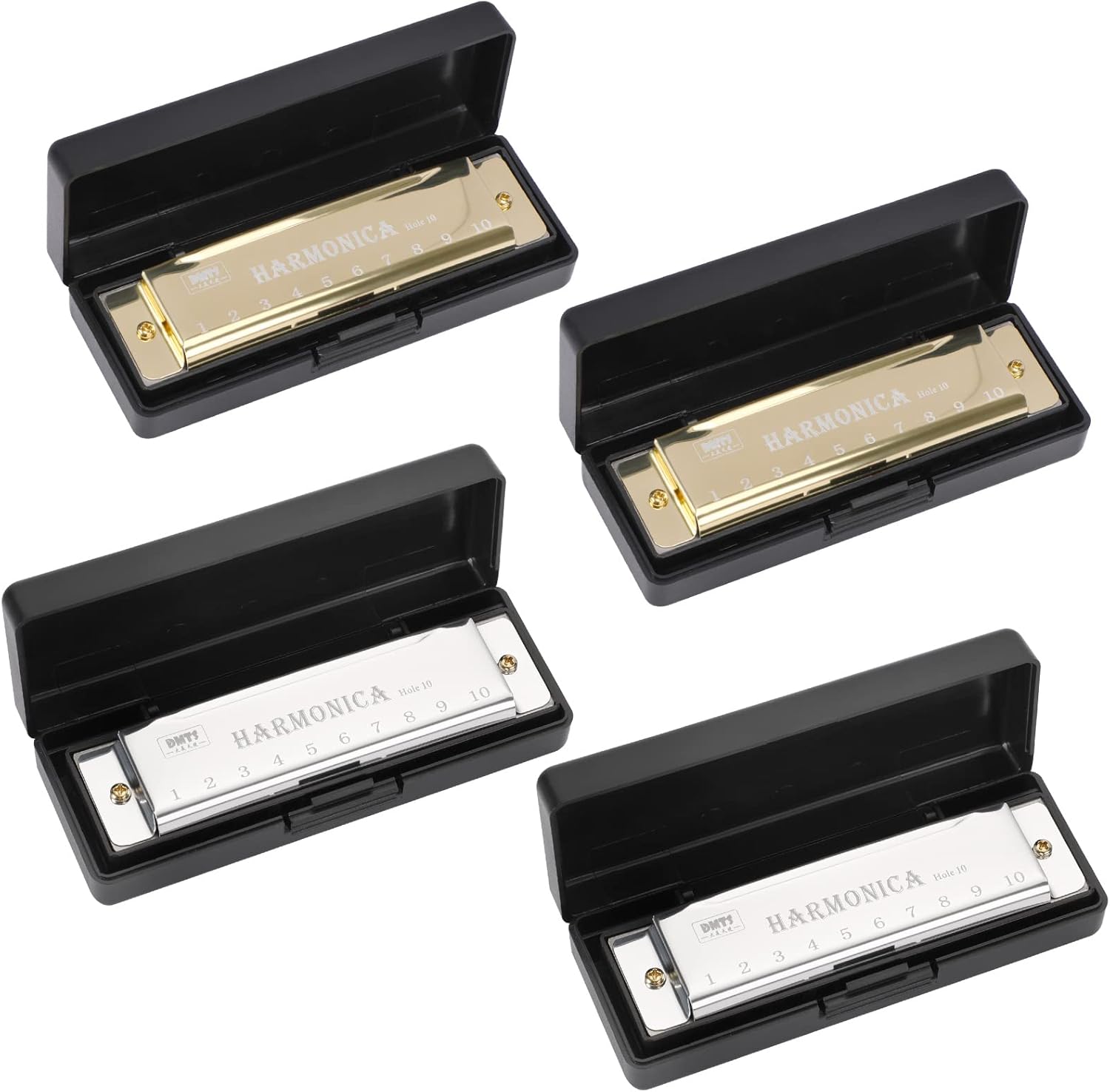UPINS Harmonica, 4PCS Key of C 10 Hole 10 Tones Titanium Color Harmonica with Case for Beginner (Gold, Silver)