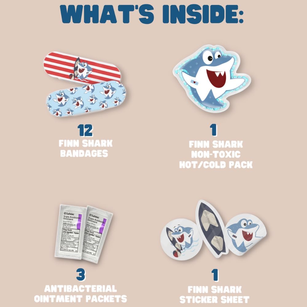 - 🦸♂️ The Set Includes: This kids first-aid kit plush includes 1-character ice pack (for hot & cold use), 12 matching Finn Shark bandages, 6 Finn Shark stickers, and 3 triple ointment packets. This infant first aid kit is packed in a secret zipper pouch on the stuffy’s back.