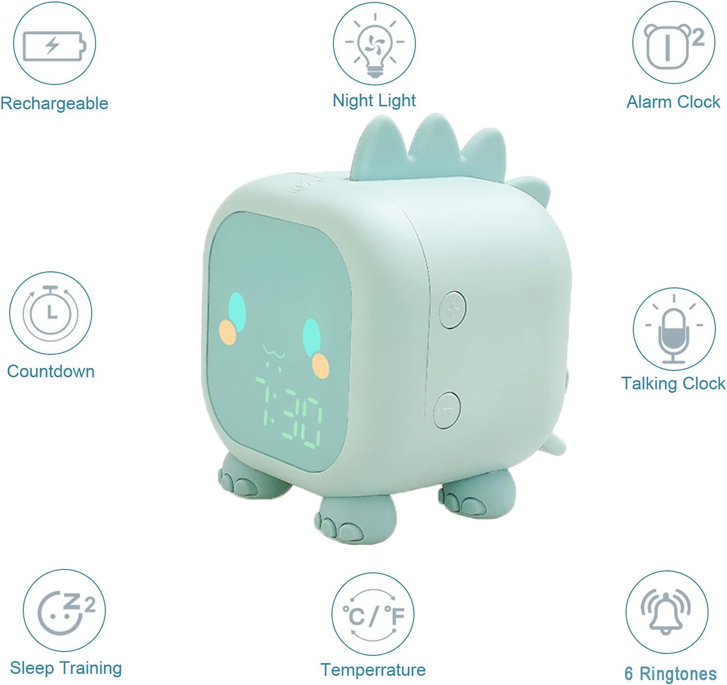 - [SLEEP TRAINING CLOCK]: The cute dinosaur-designed alarm clock uses environmentally friendly and safe silicone material, which feels soft and comfortable. The alarm clock with soft colorful lights,it is a must choice for training children to develop good sleeping habits.