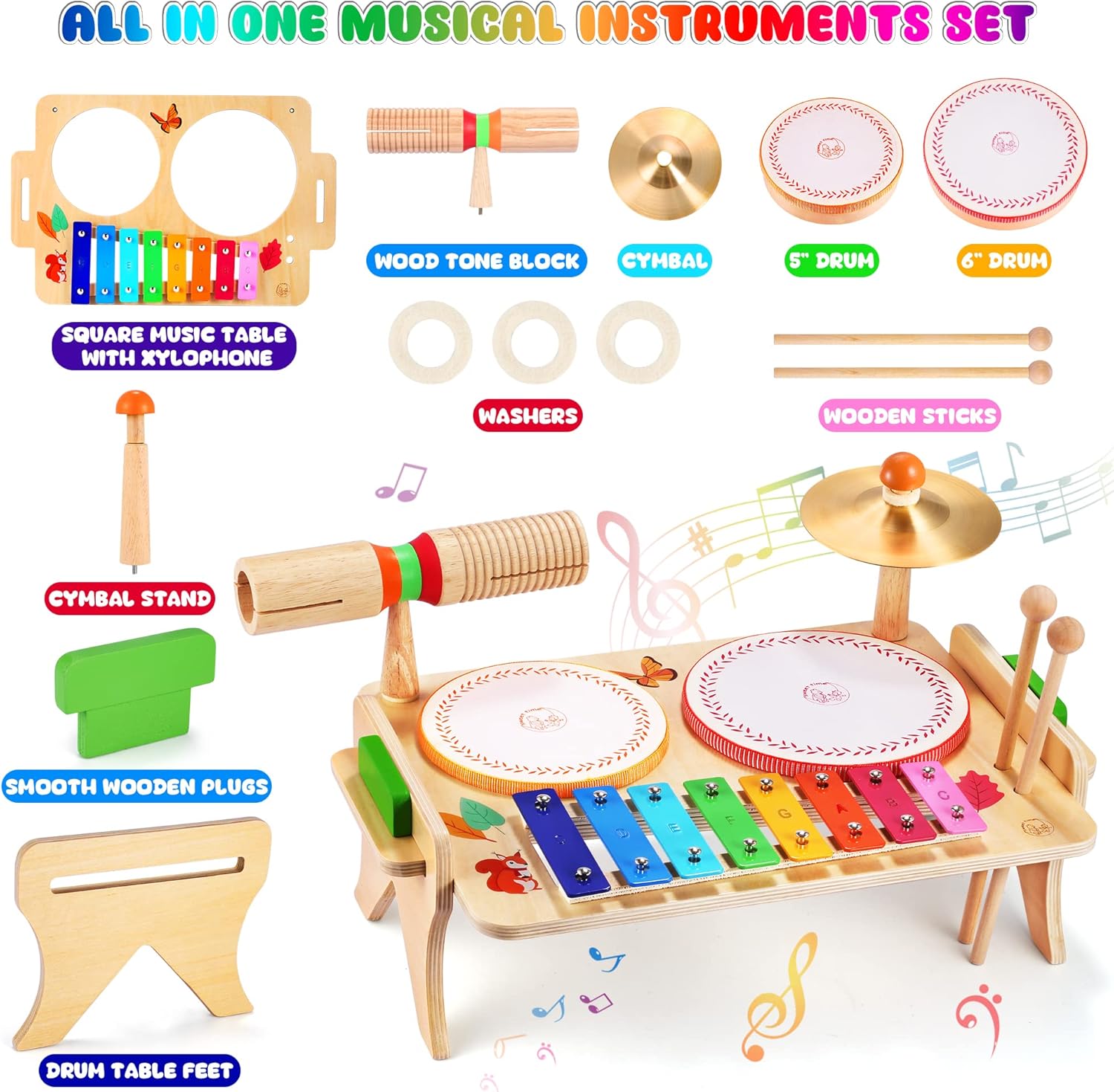 - [7 in 1 Drum for Children]: Toddler drum not only setincreas your kid's interest in music, enhances your baby's eye-hand coordination but also develops fine motor skills and auditory sensory, which is composed of 1*Square Music Table with Xylophone, 1*Wood Tone Block, 2*Wooden Sticks, 2*Drums, 1*Cymbal, 1*Cymbal Stand, 3*Washers, 2*Drum Table Feet, 2*Smooth Wooden Plugs
