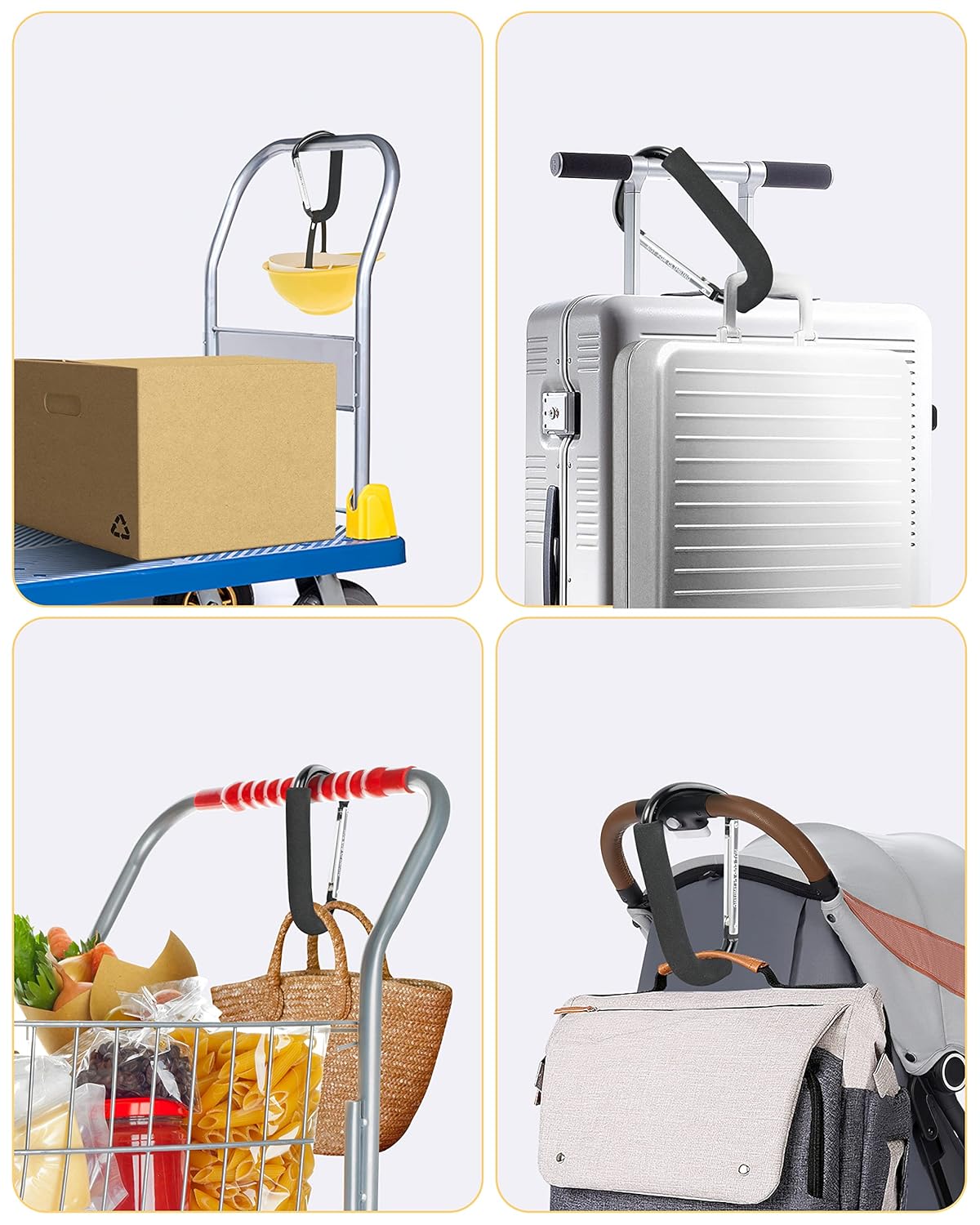 - Universally Applicable: for cart hooks, stroller hooks, suitable for carrying grocery bags, can connect bags to luggage, hiking, camping, connecting multiple dog ledges, wheelchair use.