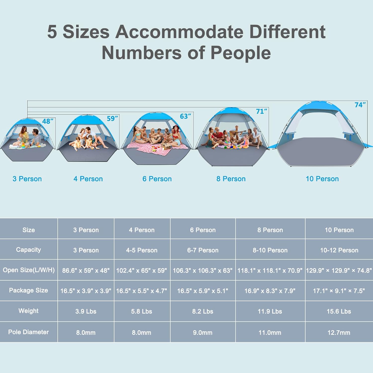 - Super Large Space: Size of 118"L x 118"W x 71"H, 30% bigger than other instant tents at a similar price, fits 8-10 people. It provides a comfortable space for family and friends on the beach