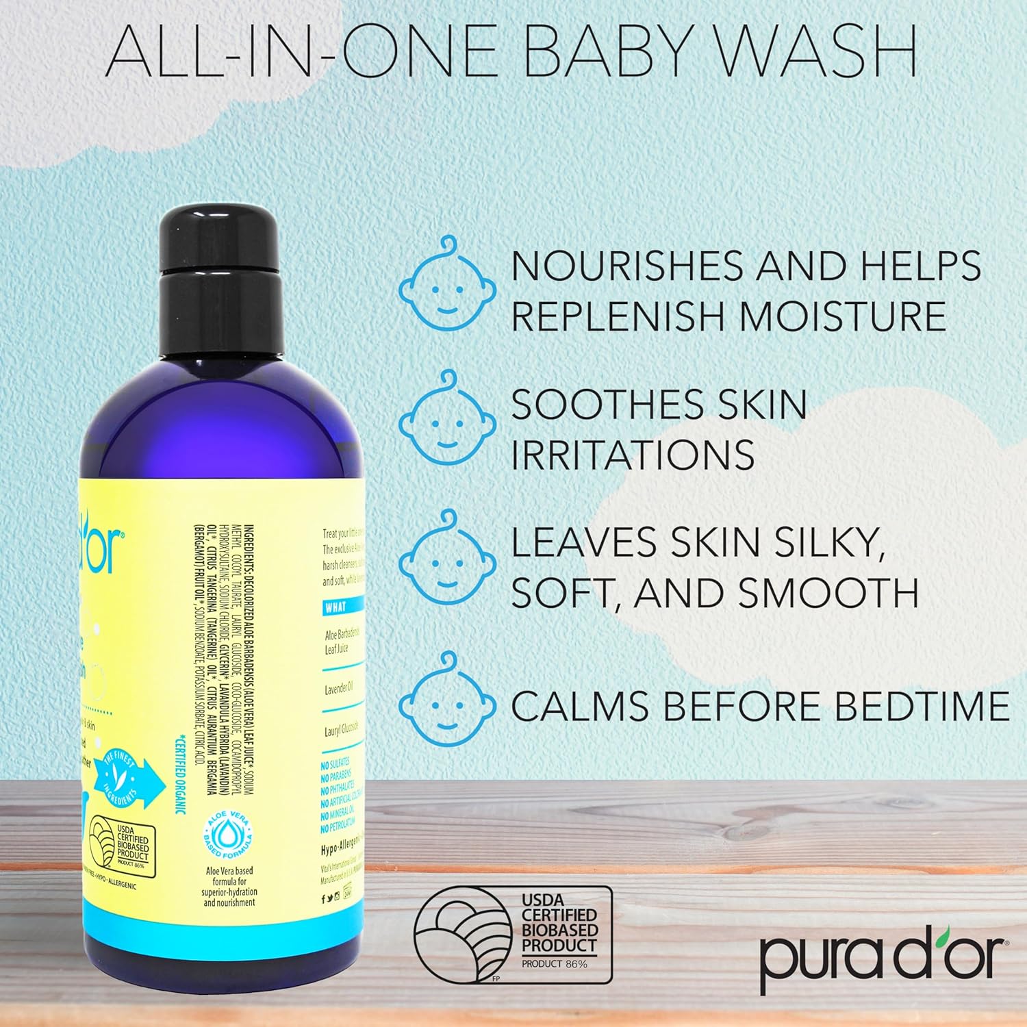 PURA D'OR All-in-One Baby Wash (16 Oz x3 = 48 Oz) USDA Biobased, Zero Sulfates, No Artificial Scents, Tear-Less, Hypoallergenic, Gentle, Calming 2-in-1 Baby Bath Wash & Shampoo