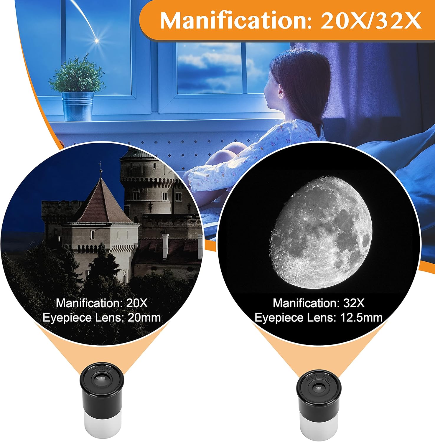 - BEGINNER TELESCOPE: 400mm focal length, 40mm aperture, comes with two replaceable eyepieces (12.5 mm and 20 mm). It is recommended to use the largest 20mm eyepiece when you first get it.5x18 finderscope can help you find the target quickly. 90°diagonal lens make observation more convenient.