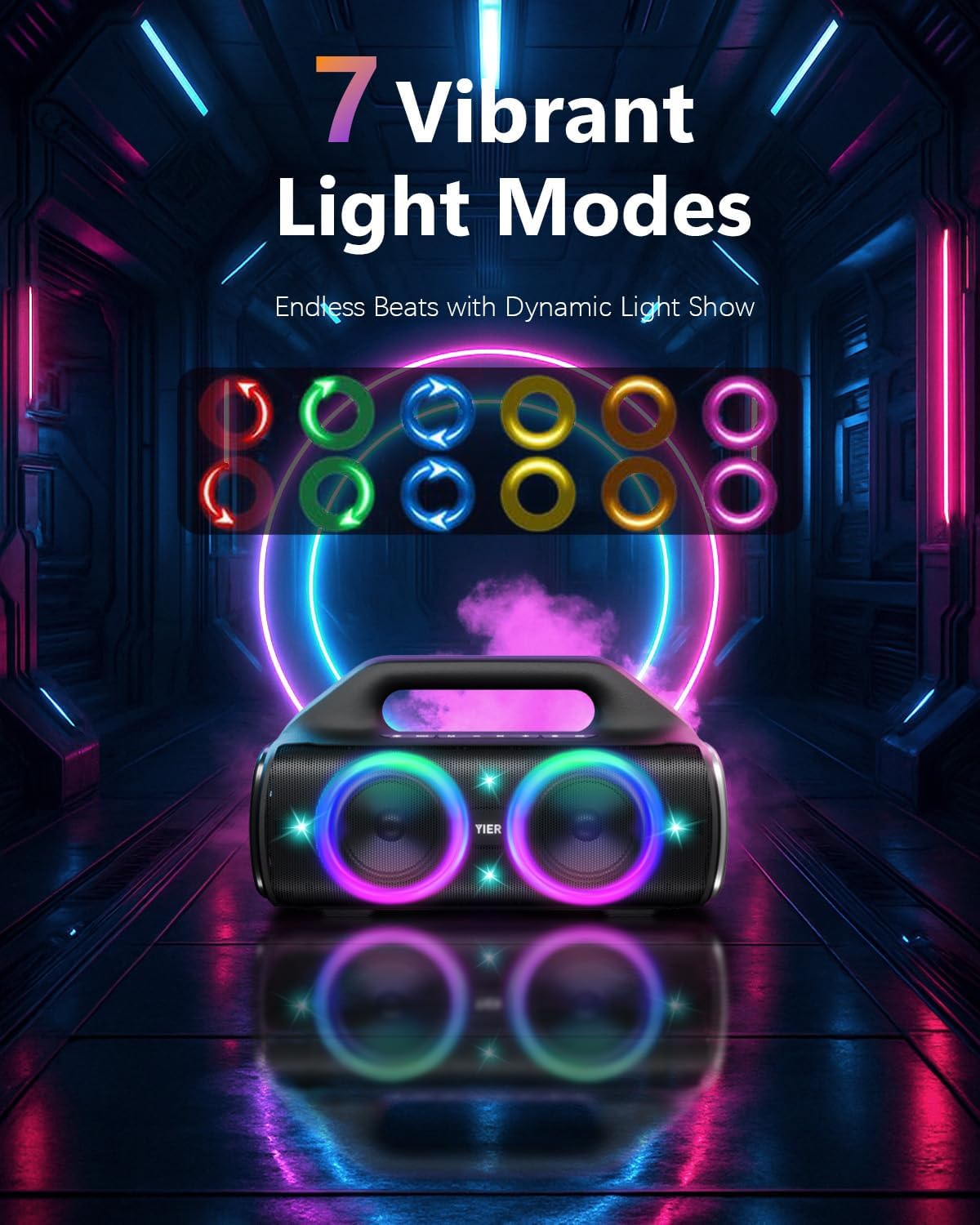 - 【TWS Stereo Surround and Light Show】Pair 2 of YIER Bluetooth speakers with lights to get the TWS function and a fully immersive and spatial audio experience. Also, the light show of speakers bluetooth wireless is crazy, it is a brand new beating mode, occupy your field of vision, light up the fiery party, and push the passion to a new level.