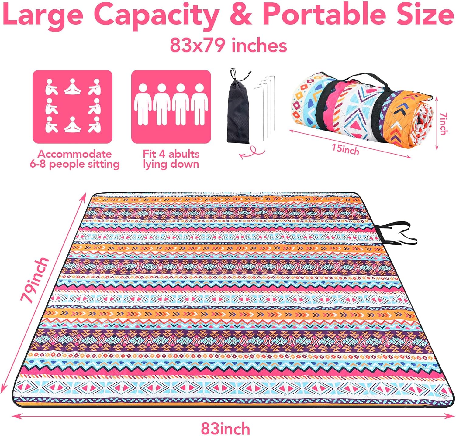 - ✅【Extra Large & Foldable Compactly】This waterproof picnic blanket with unfolding size 83"L x 79"W can comfortably fit up to 4-7 adults, still roomy enough for food & drinks. It is definitely the perfect option for your whole family or friends to enjoy outdoor dining or lounging. Whereas, enhanced Velcro makes the outdoor picnic blanket easily folded into a compact tote, so you can take it anywhere.