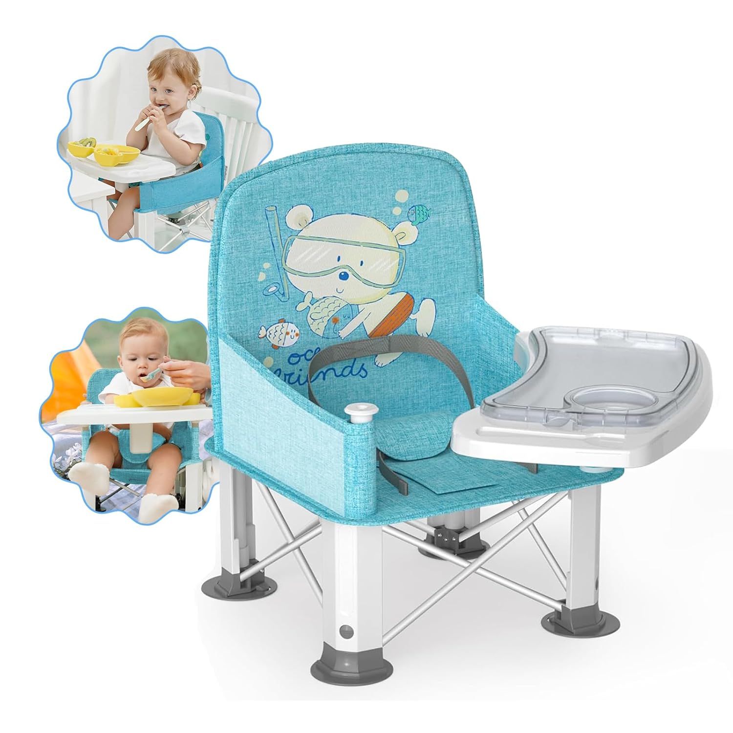 Baby Travel Booster Seat with Double Tray, BabyBond Upgraded Toddler Portable Baby Chair, Booster Seat for Dining Table, Stable and Foldable Booster Baby Chair for Indoor/Outdoor (Blue Sea World)