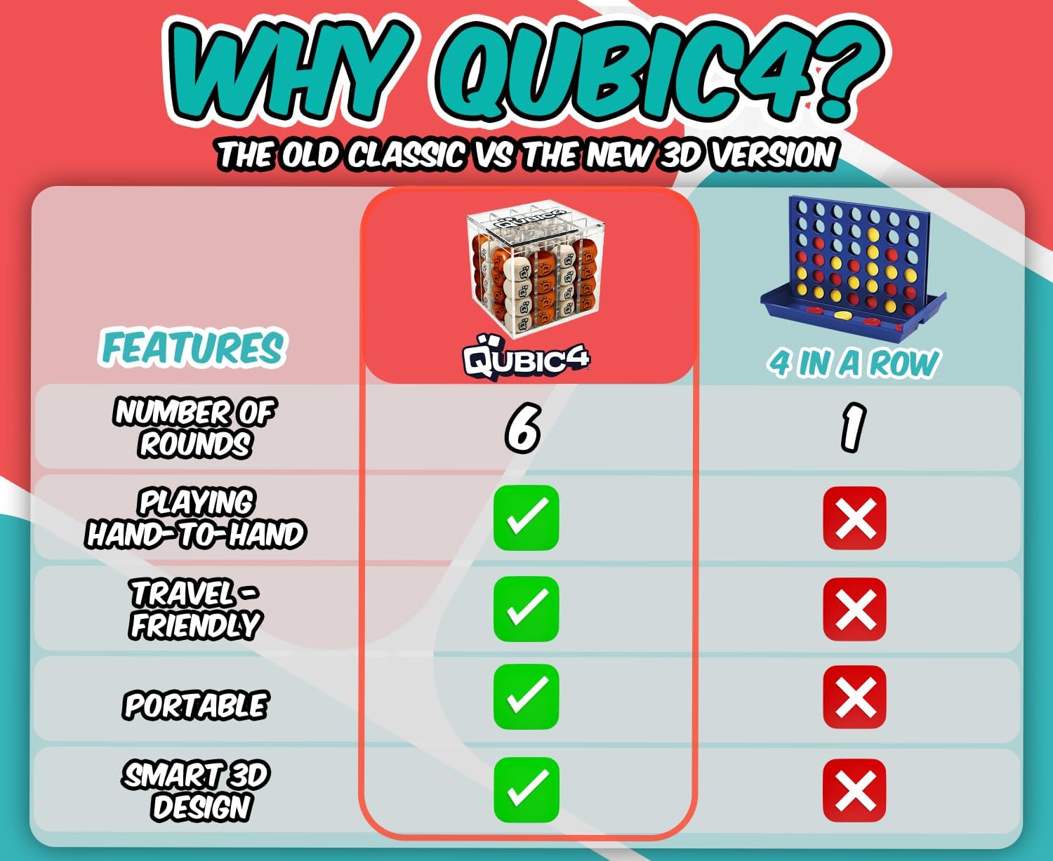 - Not Your Ordinary Color Row Game - Based on the popular 4 in a row game, but in 3D! With Qubic 4, you get 64 cubes in two different colors: Red and Natural wood. Create a pattern of four to score!