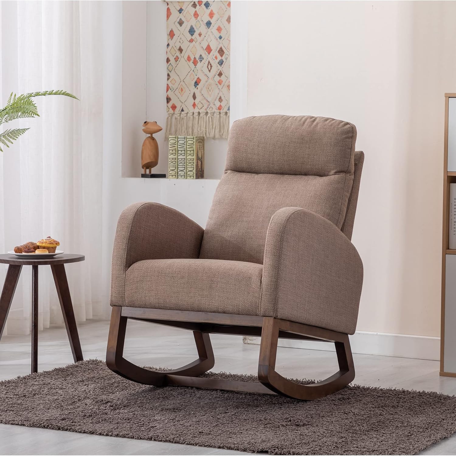 Dolonm Nursery Rocking Chair for Living Room, Upholstered Mid-Century Modern Nursery Rocking Armchair Tall Back Accent Glider Rocker, Camel