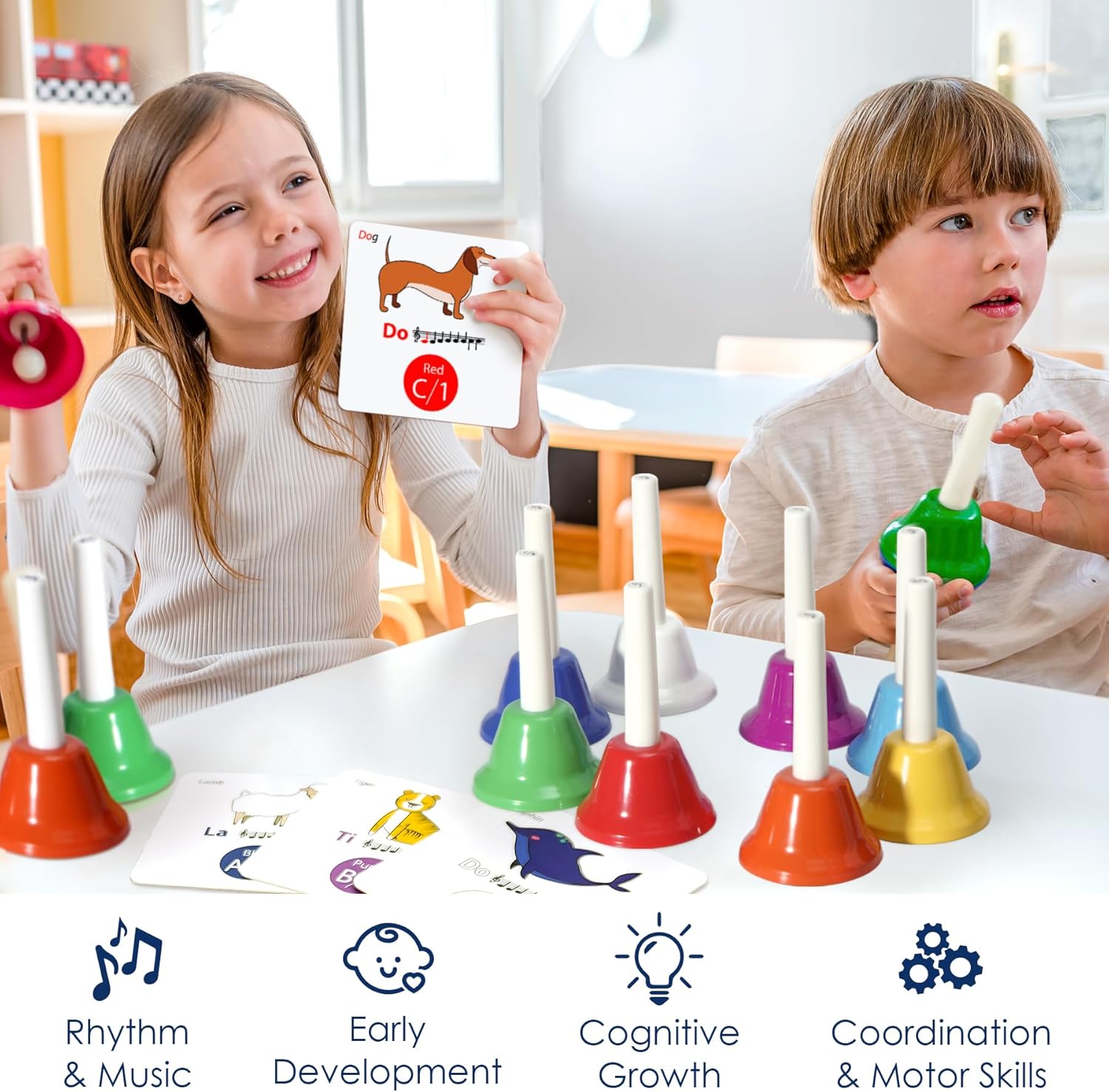 - PREMIUM PACKAGE SET FOR BUDDING MUSICIANS: The musical bell Instruments, unlock musical creativity with our set of 15 popular songs, including classics like "Twinkle Twinkle Little Star" and "Jingle Bells." to get your child off to a great start! Handbells for toddlers with musical flash cards made from durable materials, lightweight, well-tuned, hand bells are designed for tiny hands, ensuring safety and comfort. perfect for toddlers and preschoolers to dive into the joy of music exploration.