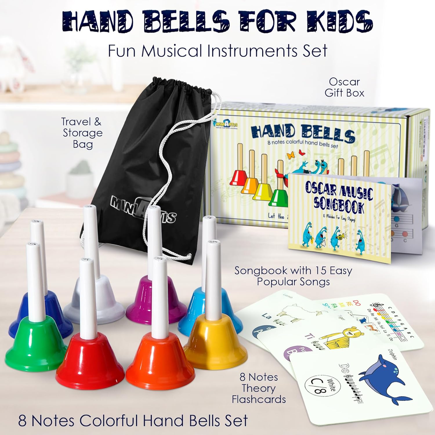 - DESIGNED FOR KIDS & ADULTS: Meet Oscar! He comes from a galaxy of rhythms & melodies and he has a passion for kids musical instruments. Oscar finds great joy in teaching children how to play the 8 note handbells with cards and practicing with bell ringing and music songbook makes for a fun learning experience full of laughter and creativity. Bells for toddlers crafted for safety and joy music bells for toddlers 1-3 ideal holiday or birthday gifts for budding musicians and musical adventurers.