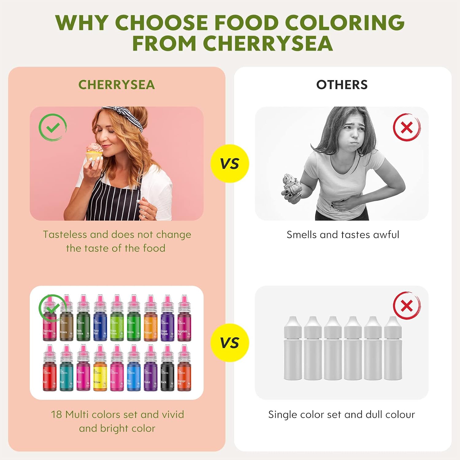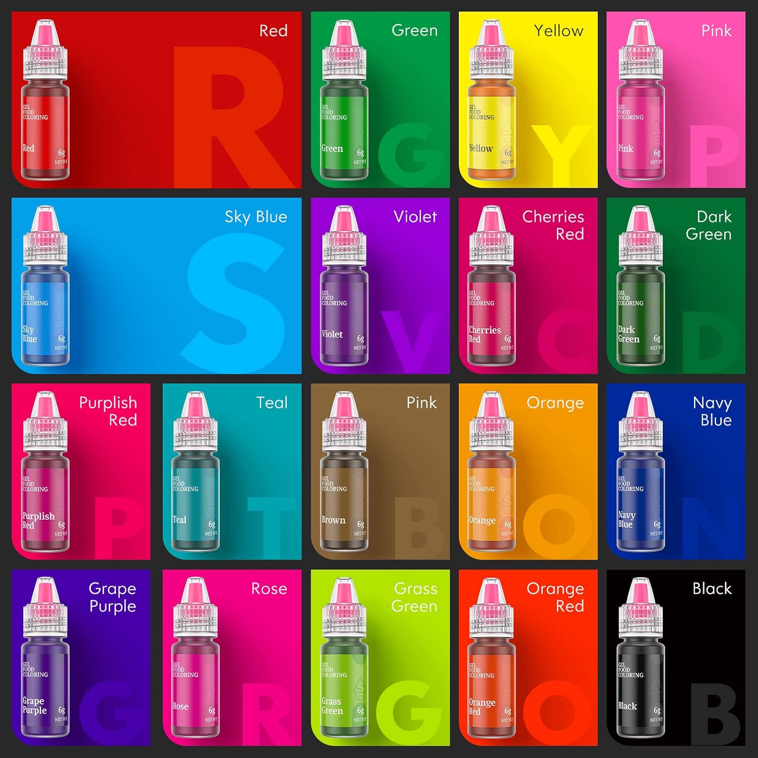 - Gorgeous Cake Coloring Baking Supplies - Cherrysea food coloring gel set inclueds:Red, Cherries red, Orange red, Purplish red,Yellow, Orange, Navy blue, Sky Blue, Teal, Grass green, Green, Dark green, Violet, Grape purple, Pink, Rose, Brown, Black. No need to be distressed by the color matching of food.This edible food dye kits includes every color series,vivid color series from to dark series and light colors