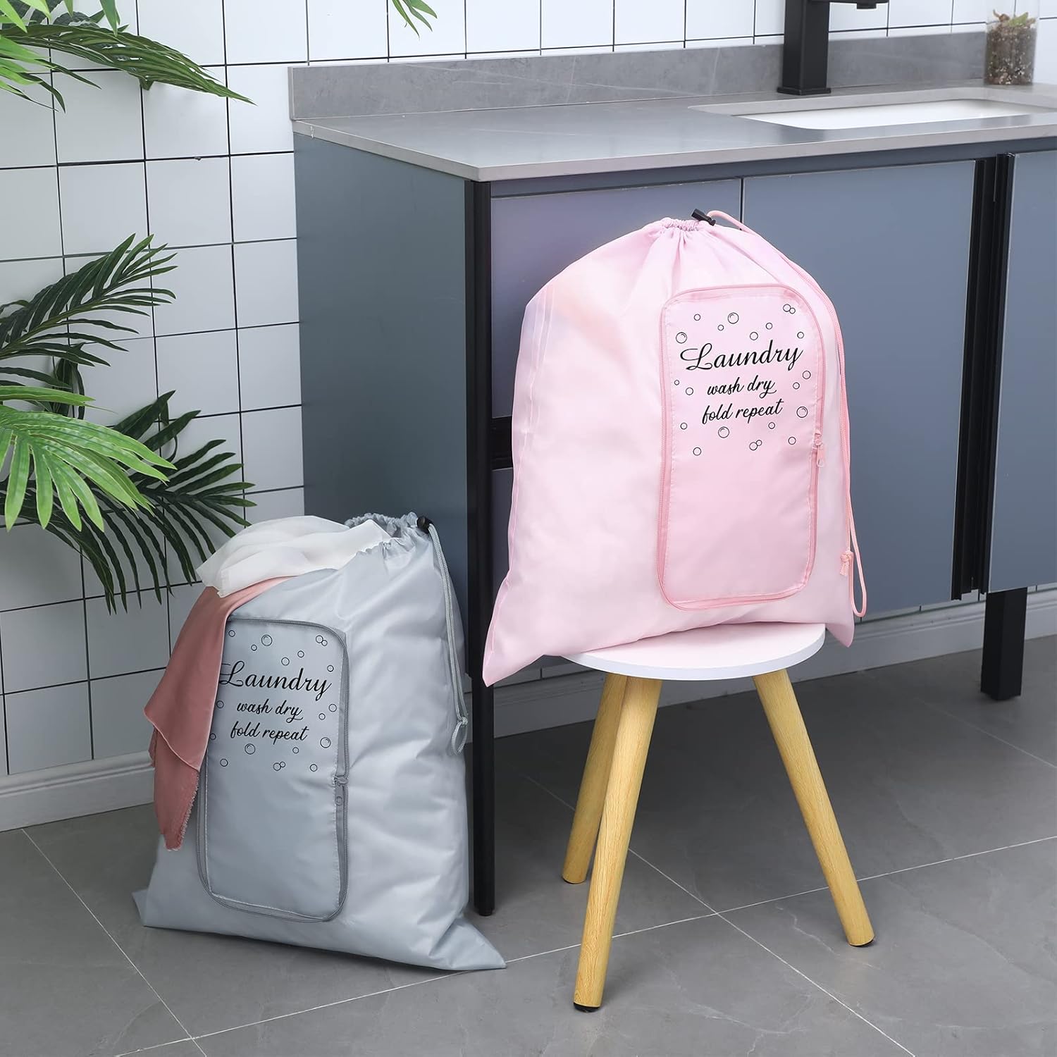 2 Pcs Travel Laundry Bag Washable Dirty Clothes Bag with Drawstring and Zipper for Suitcase, 22 x 18 Inch (Pink, Gray,Bubble)