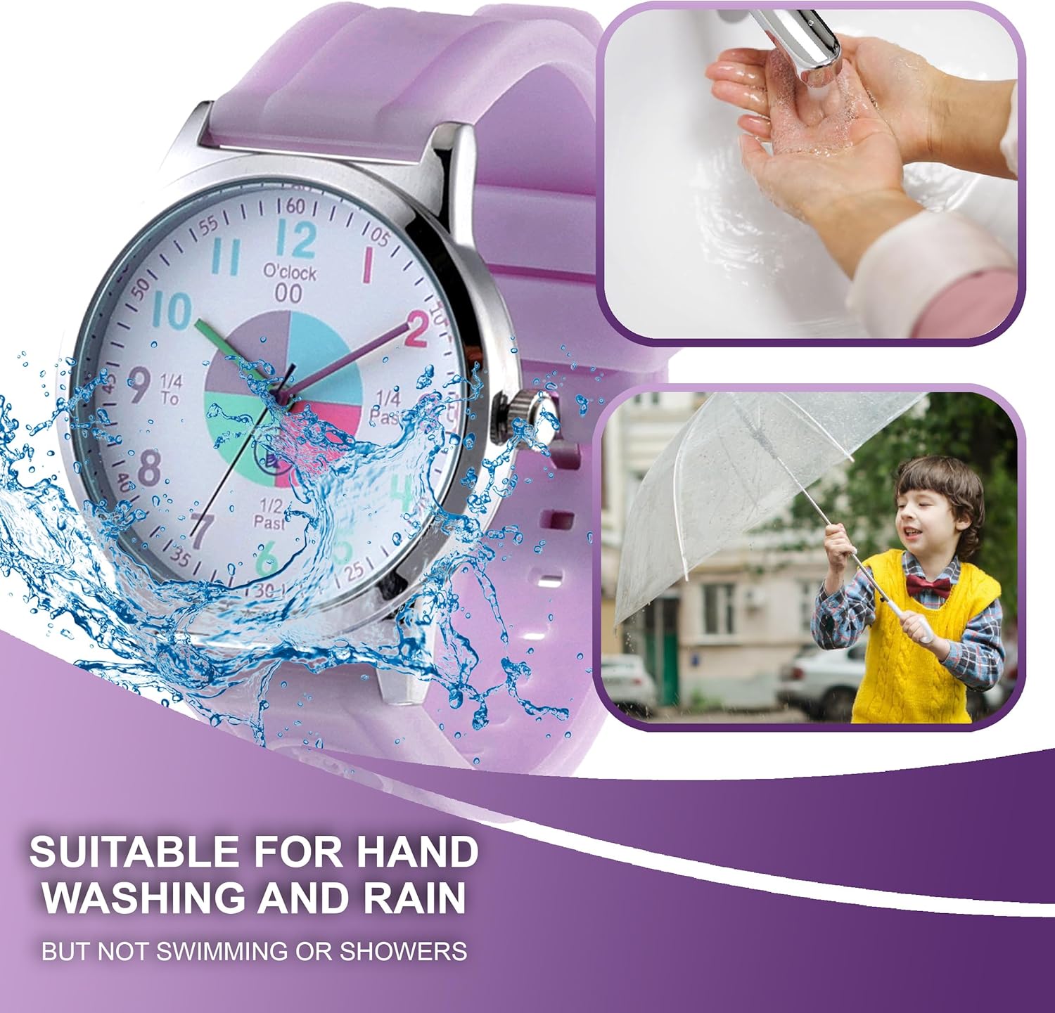 - QUALITY: Soft Purple silicone watch strap. Stainless steel back. Mineral Glass for the best clarity. This is not a kids waterproof watch but it is water resistant for everyday use.