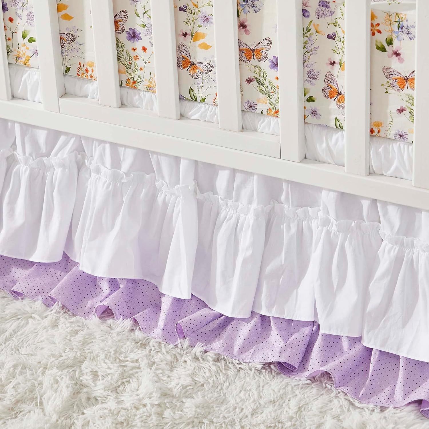 - [Unique Design by Brandream]This Baby Girls Crib Bedding Set - Transform their sleep space into a fresh springtime scene with our baby bedding. Featuring delicate butterflies floating among blooming wildflowers, the precious pastel set includes an premium cotton fitted crib sheet, a textural cotton quilt and a double ruffle crib skirt for a tailored finishing touch.