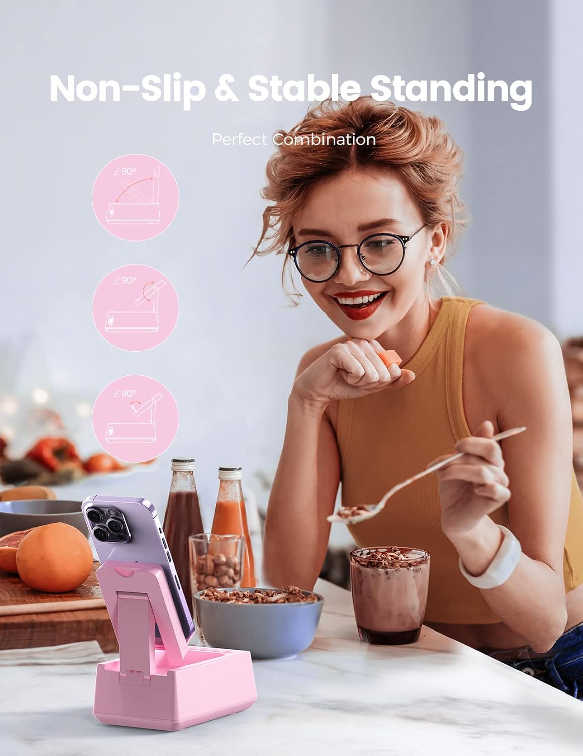 - 90° Foldable and Adjustable Angle: Let the view choose the angle, not let the angle limit the view. The 90° foldability makes the operation and viewing more free and unrestrained. Enjoy the fun of cooking, video and game at will. The weight of the bracket Bluetooth speaker is less than 380g. It is palm-sized and space saving, making it the perfect companion for outings and trips.