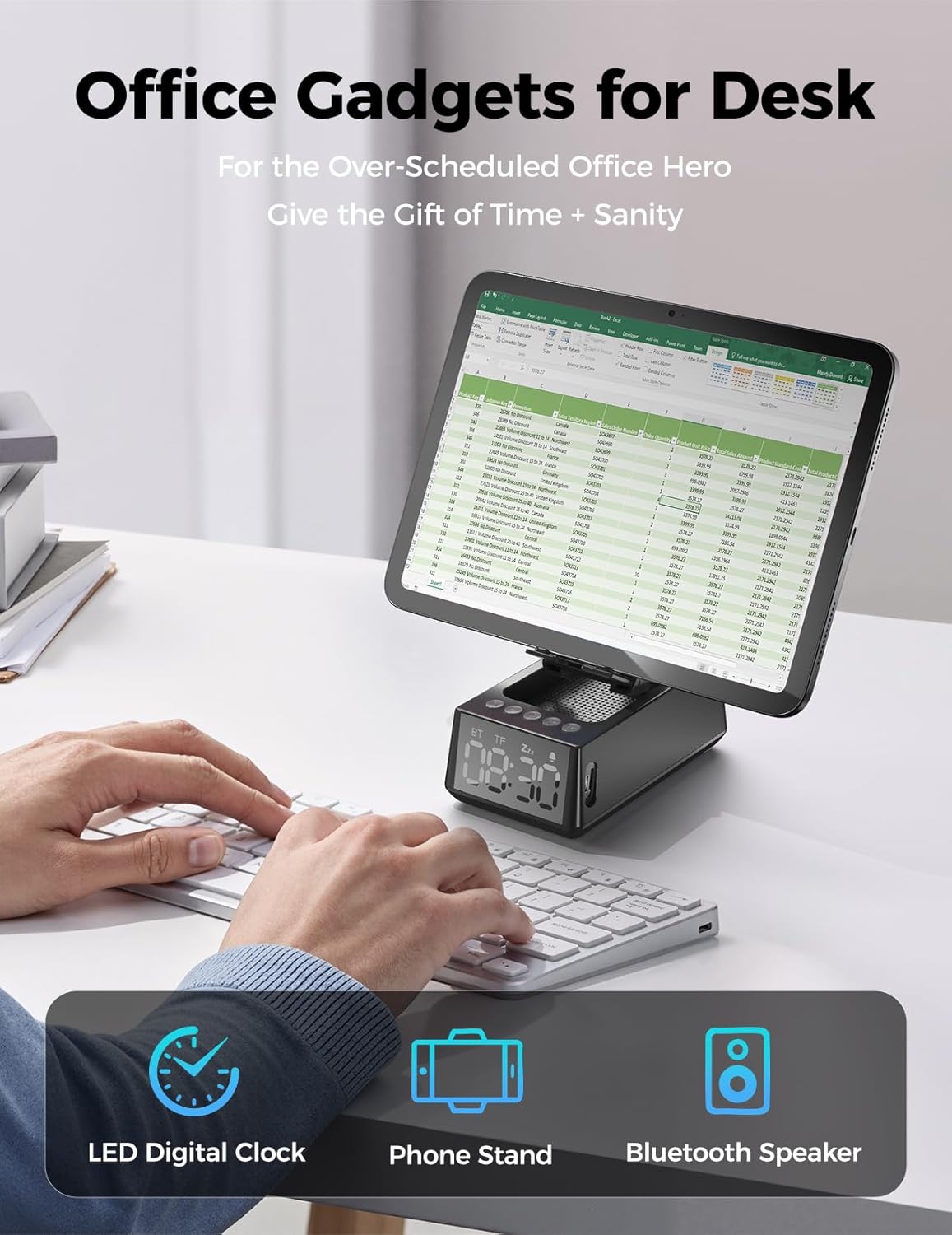 - 3-In-1 Design: A multifunctional, stylish, and cool gadget that combines a Bluetooth speaker, alarm clock, and phone stand in one. The adjustable stand is stable and meets the usage requirements for various viewing angles. It features stereo sound , with rich bass and clear treble, enhancing your audio experience when used with a phone, suitable for binge-watching, gaming, making video calls without hands to hold phone, or online meetings. This is the perfect gift for oneself and others.