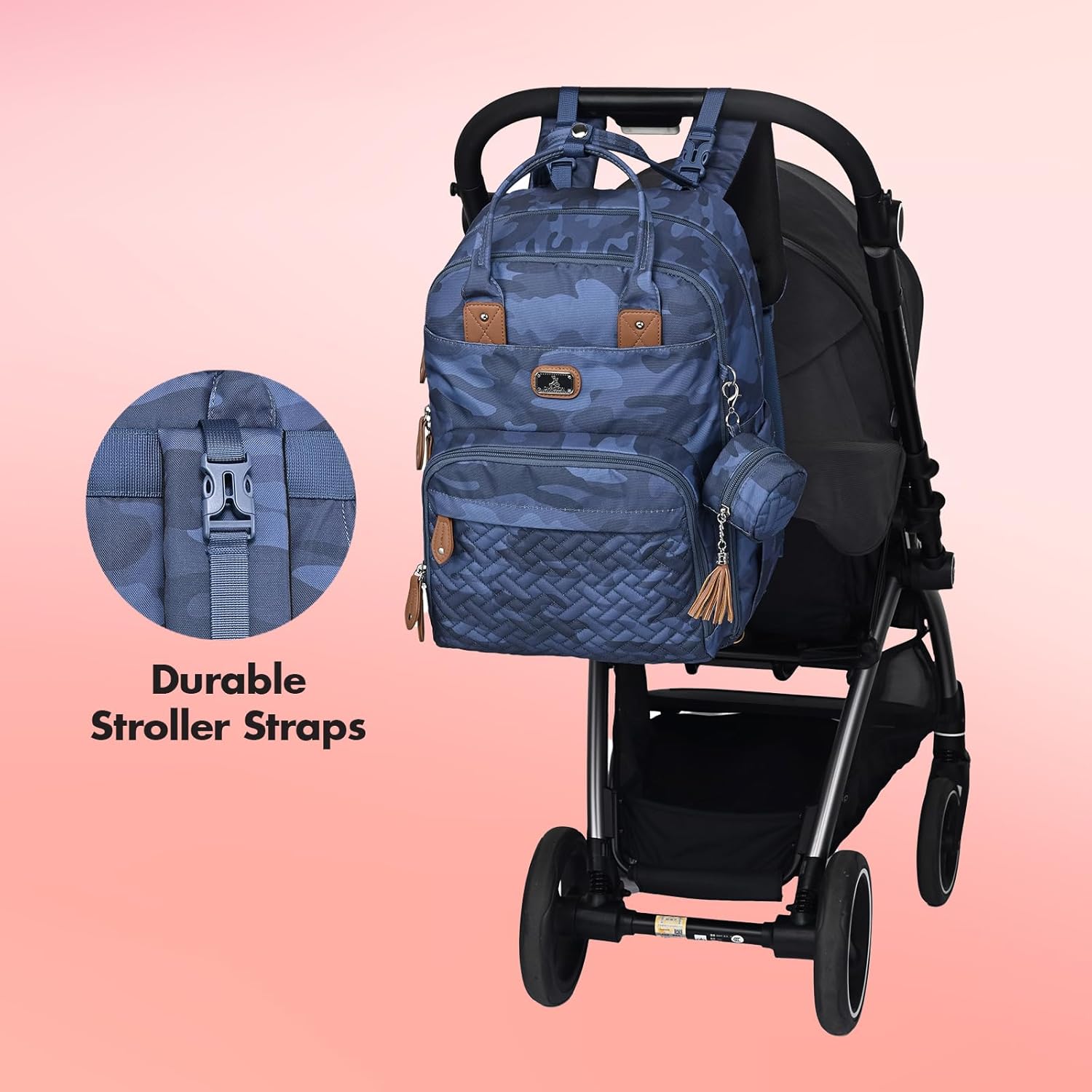 - Pacifier Case & Portable Changing Pad: The removable pacifier pod can hold two pacifiers to keep them readily available and clean; The D-shaped ring allows you to quickly and easily install the pacifier holder or other essentials like diaper bag dispenser, small accessories, etc; Also comes with a travel changing mat with diaper pocket & wipes pocket as well as a mom’s pockets with a wrist strap for quick, on-the-go changes
