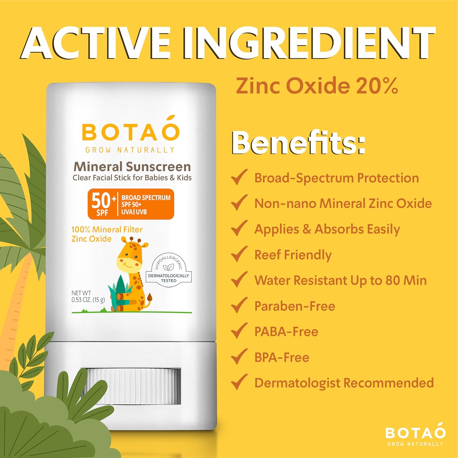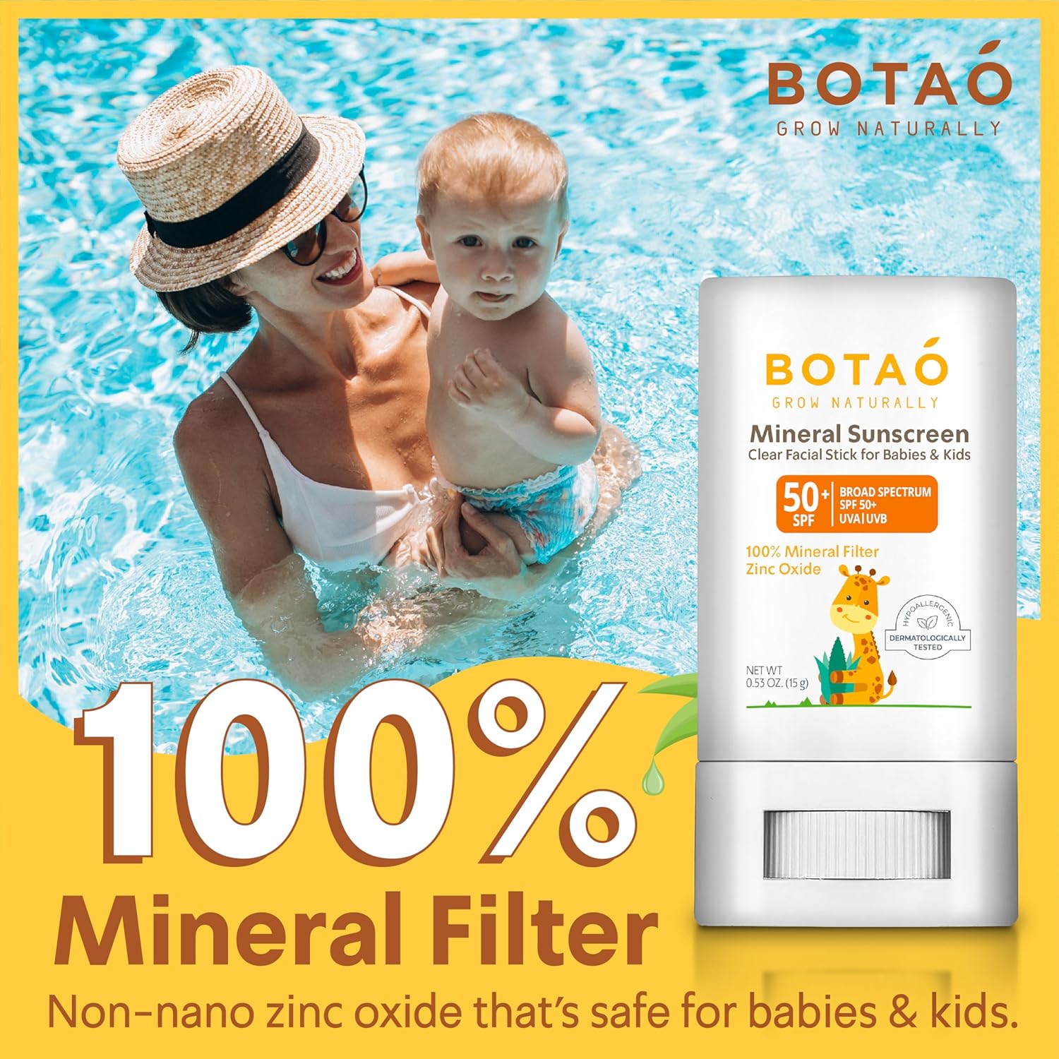 - NATURAL PROTECTION: Botao baby mineral sunscreen provide effective SPF 50+ sun protection for babies & kids, broad spectrum against UVA + UVB RAY EASY APPLICATION: Supplied as a convenient sunscreen stick, the hydrating sun cream is quick and easy to apply The fast absorbing sun lotion won’t leave skin feeling oily or sticky CLEAN MINERAL FORMULA: NO: PABA parabens phthalates BPA oxybenzone, avobenzone, petroleum, gluten, dairy, or toxic chemicals. ITS UNSENTED FOR SENSETIVE SKIN- BOTAO BABY mineral sunscreen stick is tested for babies sensetive skin WATER RESISTANT : 80 MINUTES