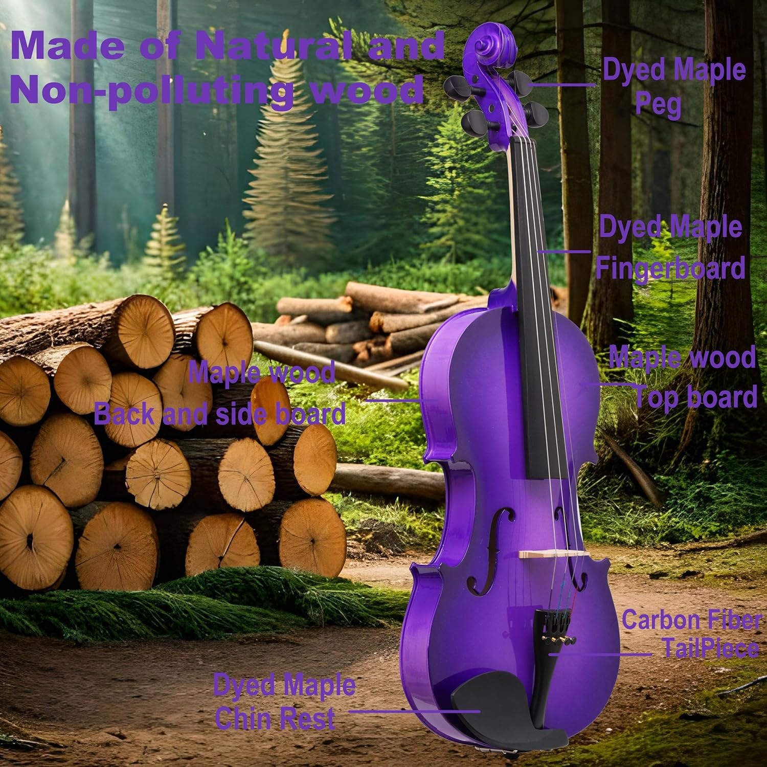 4/4 Full Size Fiddle Purple Colored Premium Violin Outfit for Beginners Adults Kids With 5 Color Fingering Tape- Handcrafted Student Beginner Violin. (Purple, 4/4 Full)