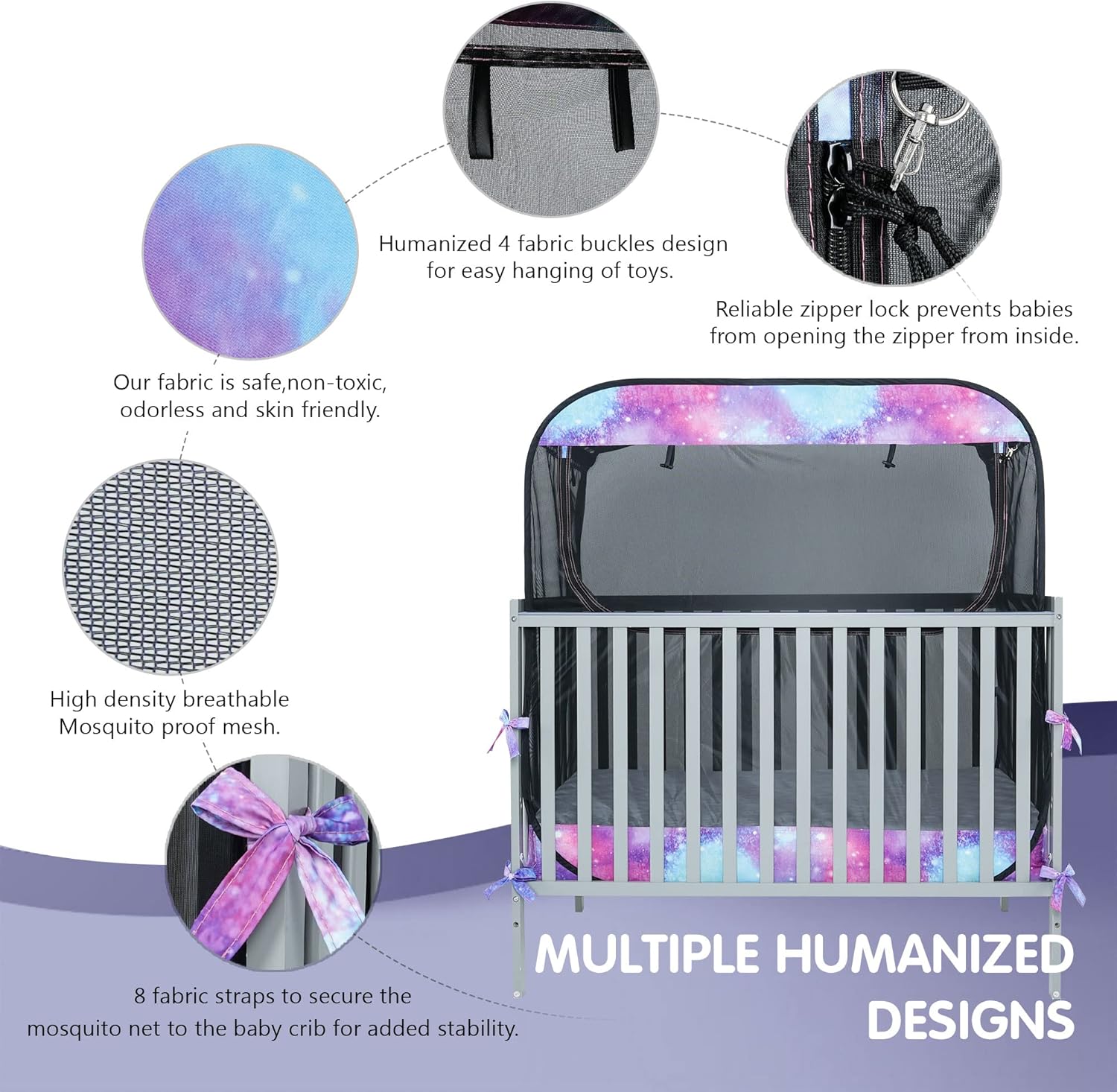 - VERSATILE USE - Our team's initial design goal was to prevent baby from climbing onto the crib, avoiding the danger of falling and limbs getting stuck by the fence. Additionally, our baby crib net can prevent mosquito bites and provide a safe, comfortable, and breathable protective space for your active baby, allowing parents to rest assured.