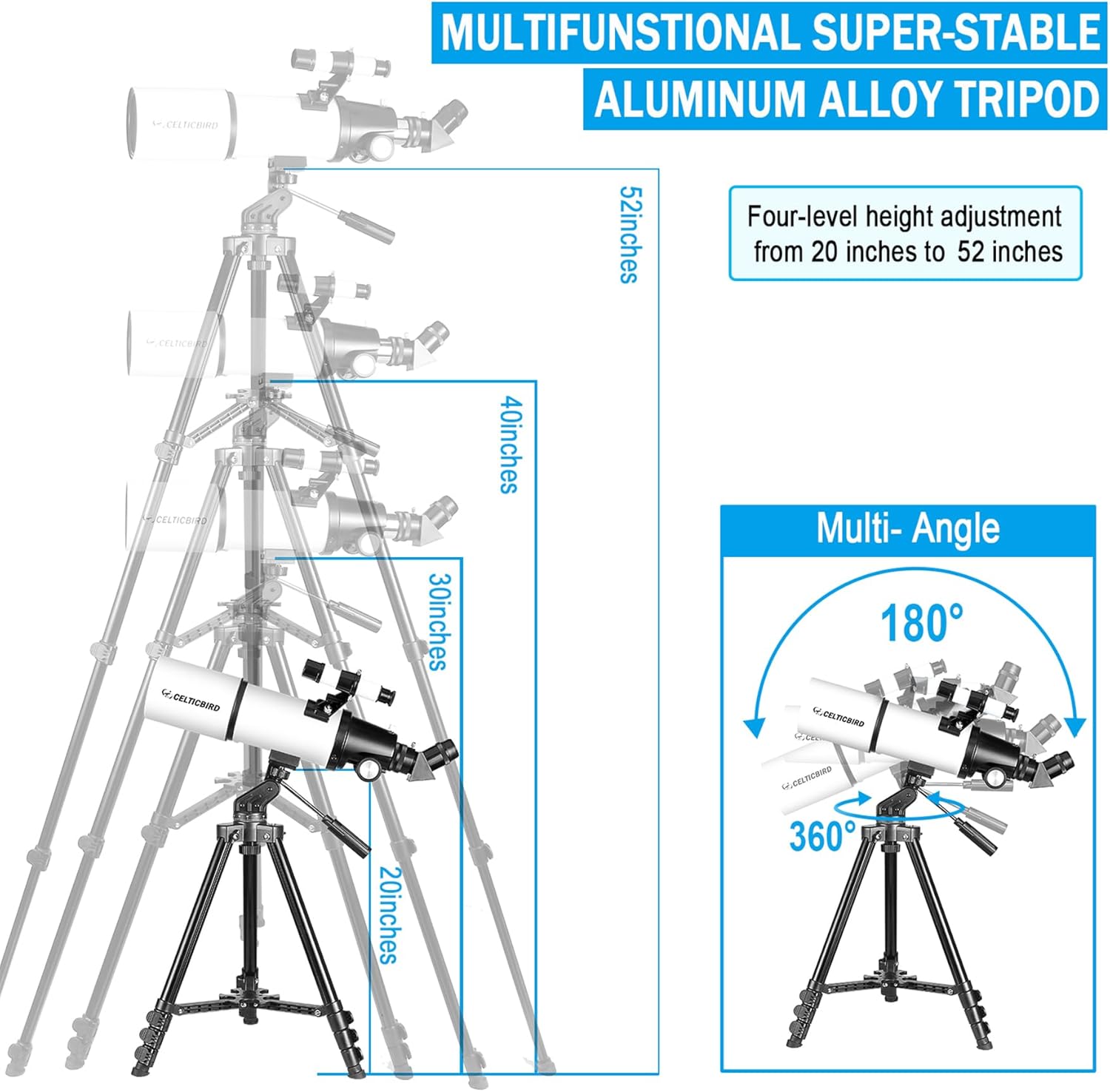 - 【Portable & Stable】Our refractor telescope has a backbag, an adjustable aluminum tripod and an upgraded phone adapter. All accessories can be packed into the bag, which is convenient for you to carry and storage for traveling. The tripod is stable and the height can adjust from 17.7" to 52", which is suitable for adults and kids. With the phone adapter, you can take amazing photos through your phone.