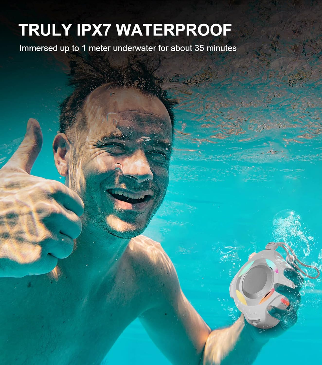 - [IPX7 Waterproof Speaker Floatability] The waterproof shower speaker is IPX7 waterproof and has been rigorously tested to withstand complete immersion in one meter of water for 30 minutes and can even float on the surface of the water. This portable speaker, waterproof, dustproof, sweatproof, rainproof, snow proof, suitable for most environments, ideal for pool sports, kayaking, bathrooms, beaches, boating, camping and travel.