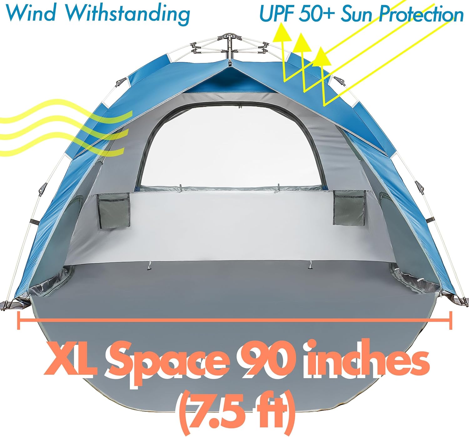 - SPACIOUS FAMILY BEACH HAVEN: Generously sized at 90" L x 59" W x 50" H, this extra-large pop-up sun shelter comfortably accommodates 3-4 adults or a family with kids and gear; ample headroom and floor space create a relaxing beach cabana experience