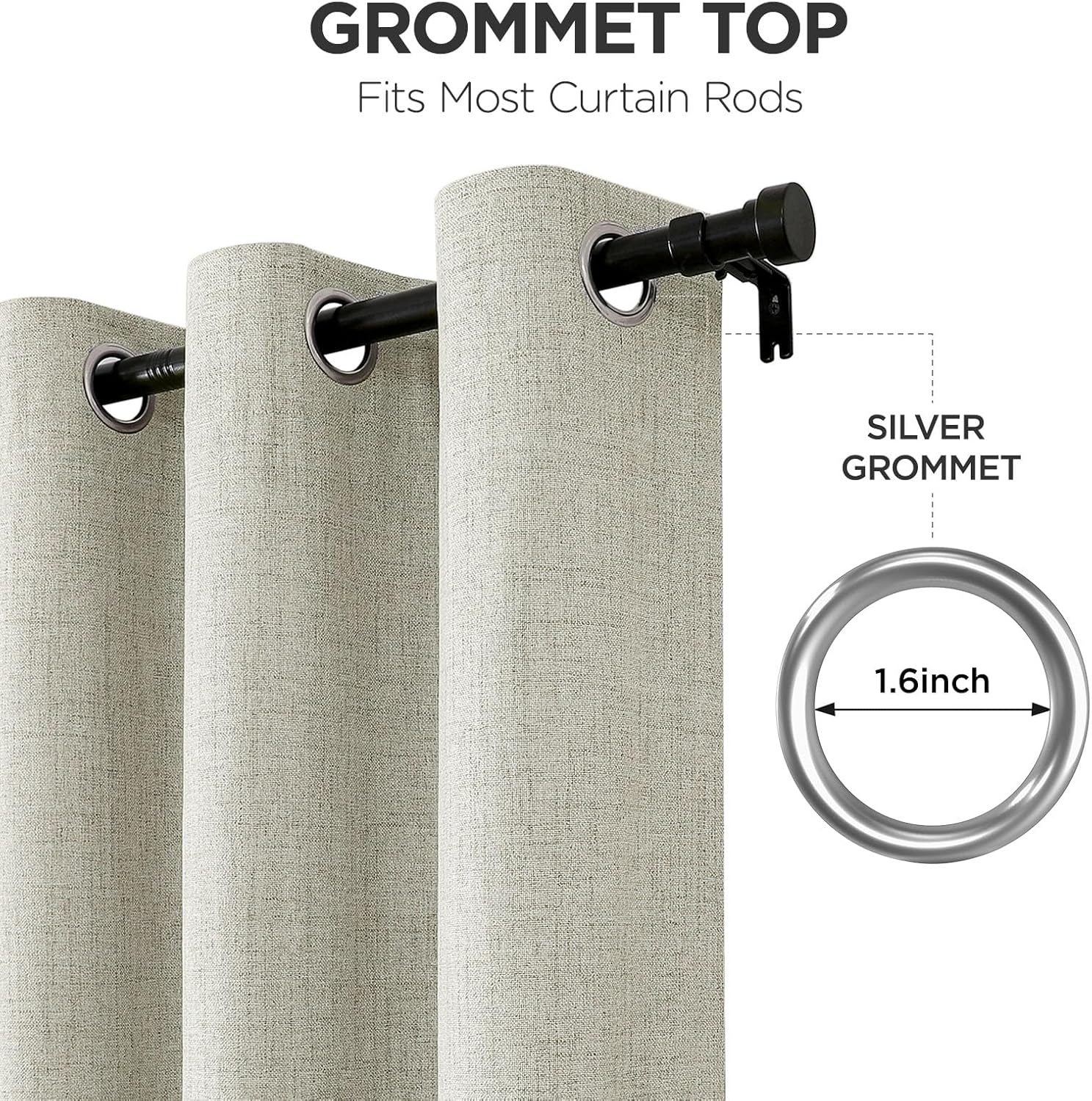 - Smooth-Glide Grommet Design: The room darkening curtains are designed with Grommets. This design adds a metal ring at the top of the curtain to make it easier to slide and distribute the weight of the curtain fabric evenly. 8 metal grommets per sun blocking curtains ensure effortless sliding on rods up to 1.5" diameter. Evenly distributes fabric weight while adding modern sophistication to bedrooms, offices, or living rooms (Rods not included)