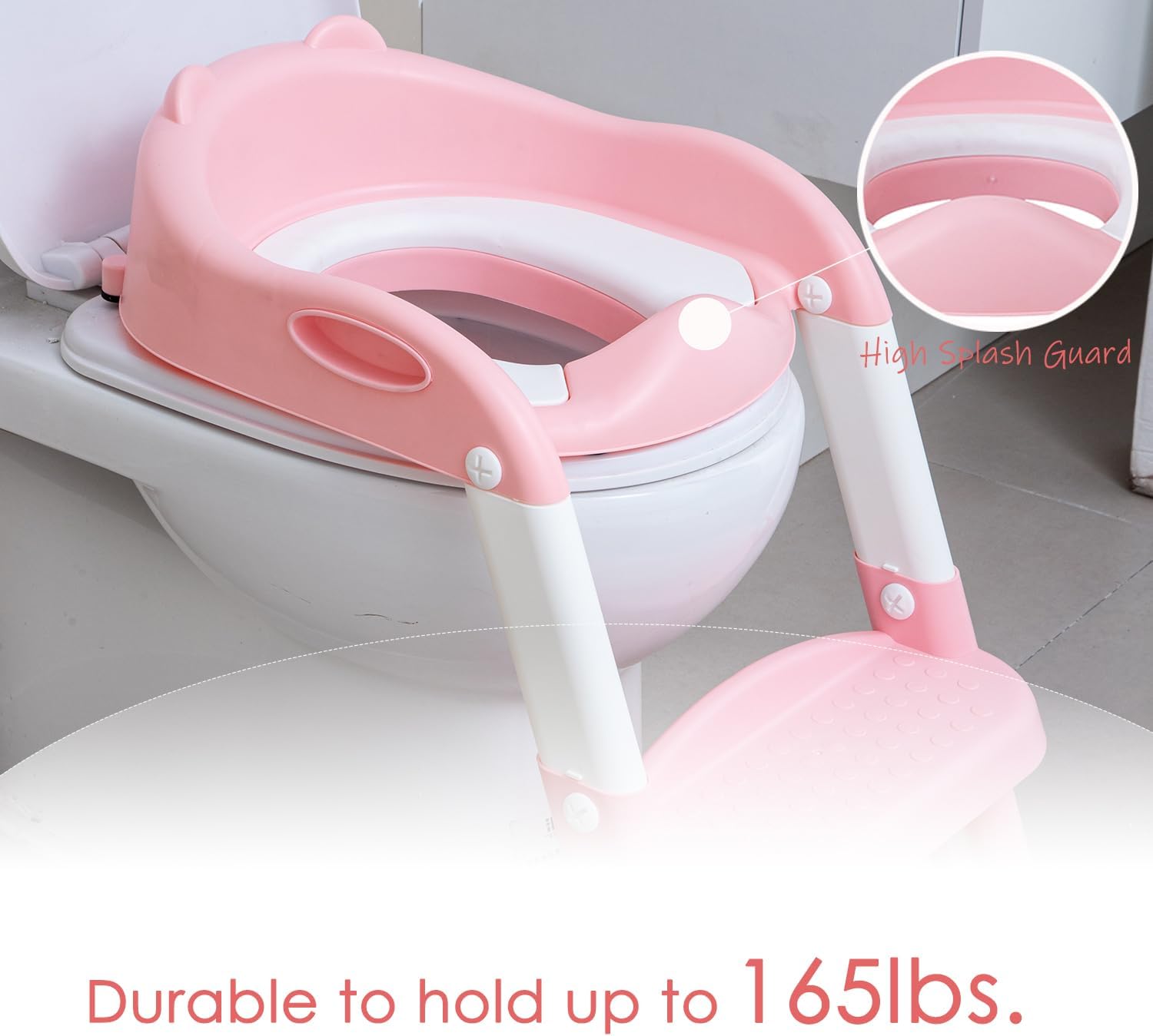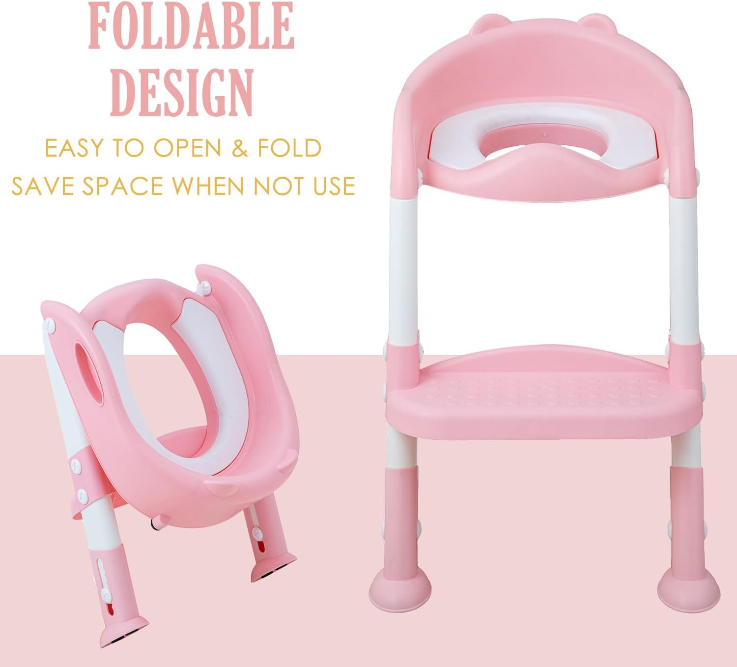 Potty Training Toilet Chair Seat with Step Stool Ladder for Kids and Toddler Boys Girls - Foldable Height Adjustable Children Toilet Training Seat with Safe Handles & Anti-Slip Pads, White-Pink