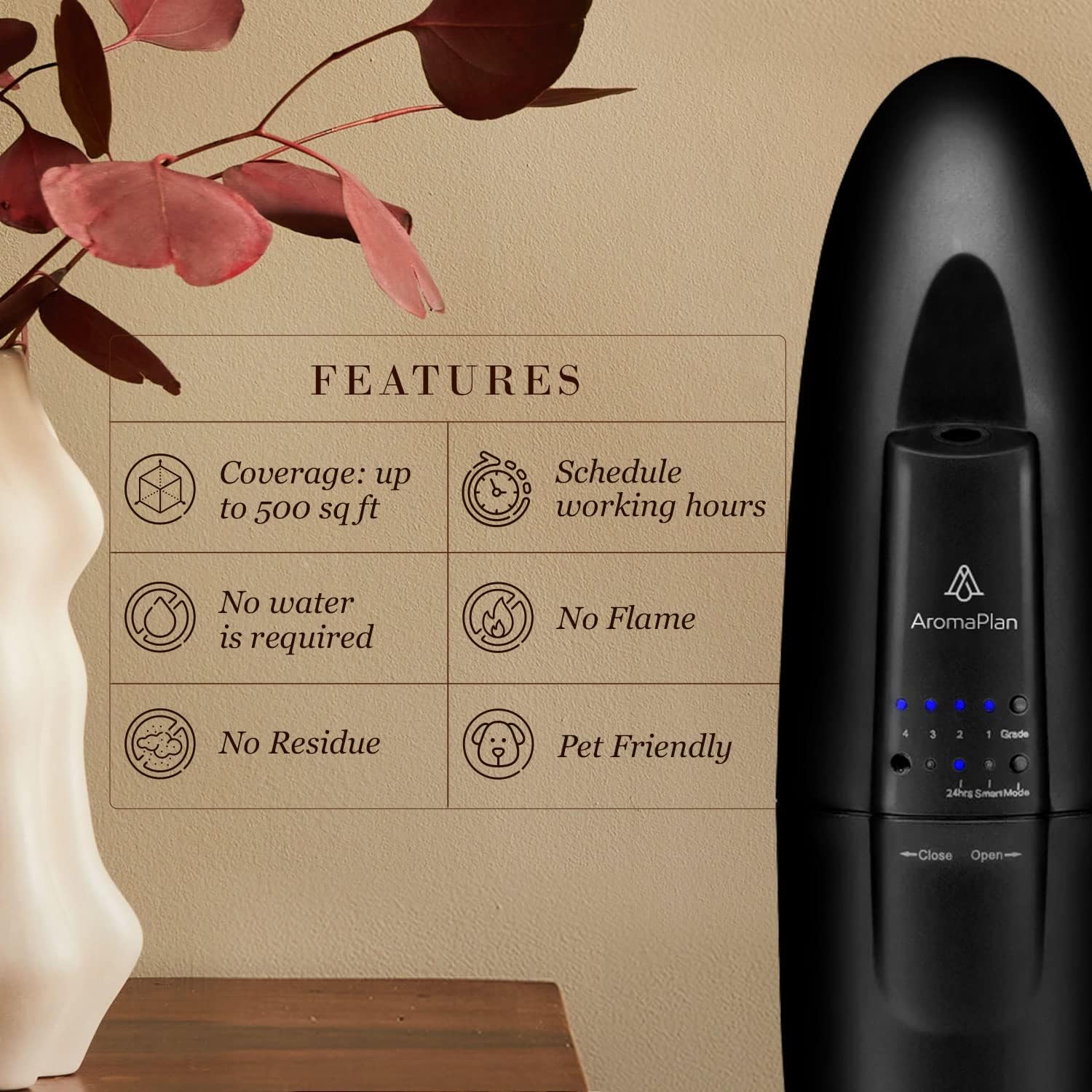 - AMAZING FRAGRANCE IN EVERY CORNER - The AromaPlan nebulizer has an incredible 500 Sq Ft coverage so that every area of your home, office, spa or commercial space will smell and feel like a 5-star hotel. The AromaPlan diffuser system is very user-friendly, with automatic mode and scheduling on/off according to your daily needs.
