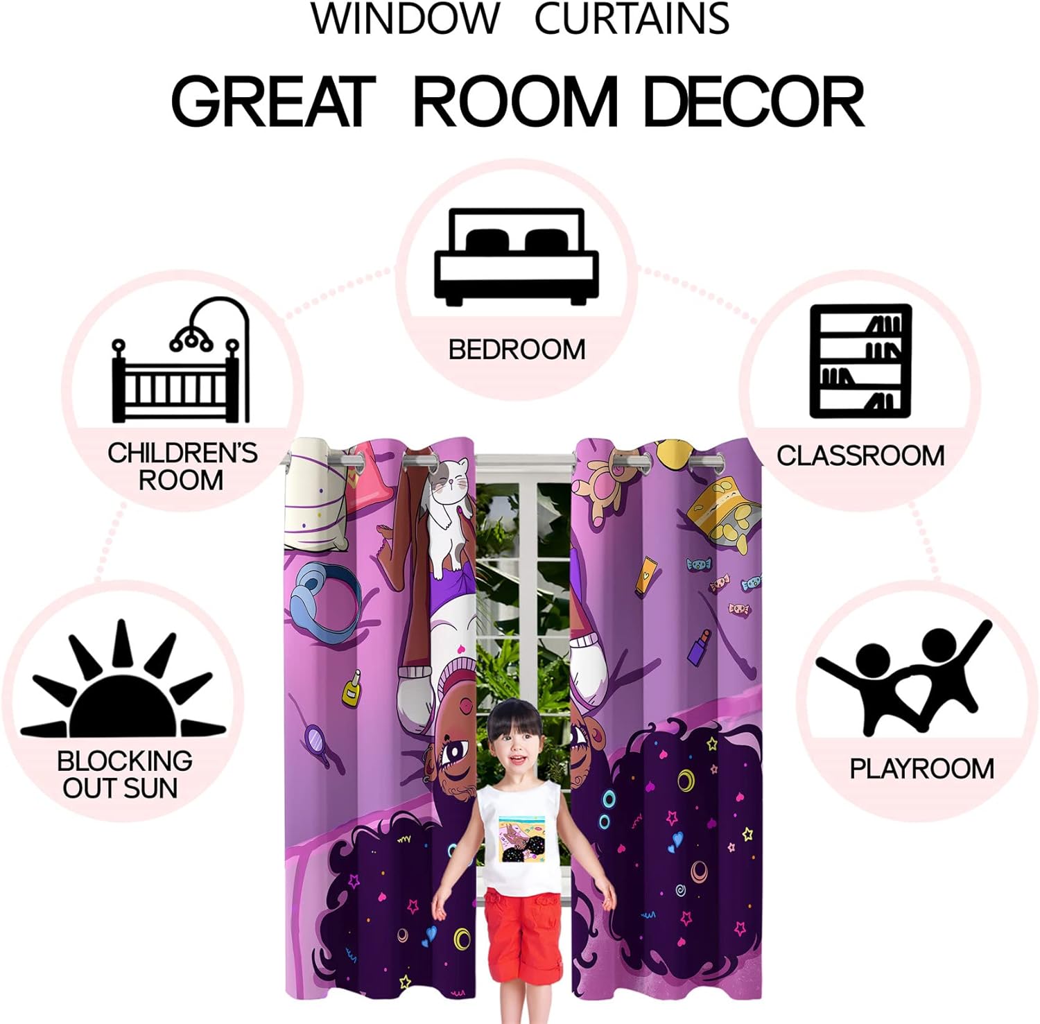 Black Girl Blackout Curtains 2 Panels 63" Inch Drapes for Kids Nursery Bedroom Purple Girls Blackout Curtains Cute Girls Themed Grommet Top Thermal Insulated Curtains for Nursery, 82" x 63"