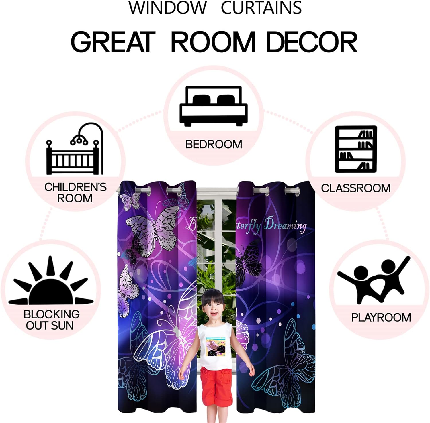 Butterfly Blackout Curtain for Girls Bedroom 2Pcs, Purple Window Curtain Panels Drapes Set Curtains 63 inch Length for Kids Bedroom Nursery Room Grommet Top Thermal Insulated Curtains, 82" x 63"