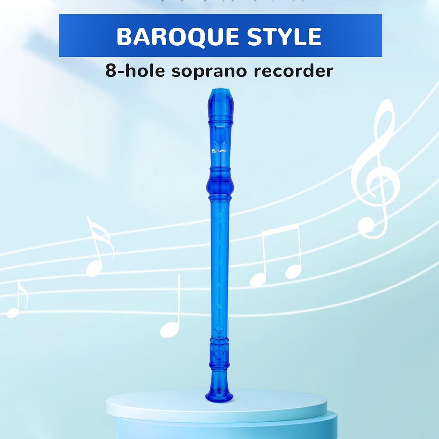 SWAN Soprano Recorder Instrument for Beginners Kids Student - Baroque Style 8 Hole Flute Detachable 3pcs ABS Descant Recorders with Cleaning Rod and Fingering Chart, SW8KT, Transparent Blue