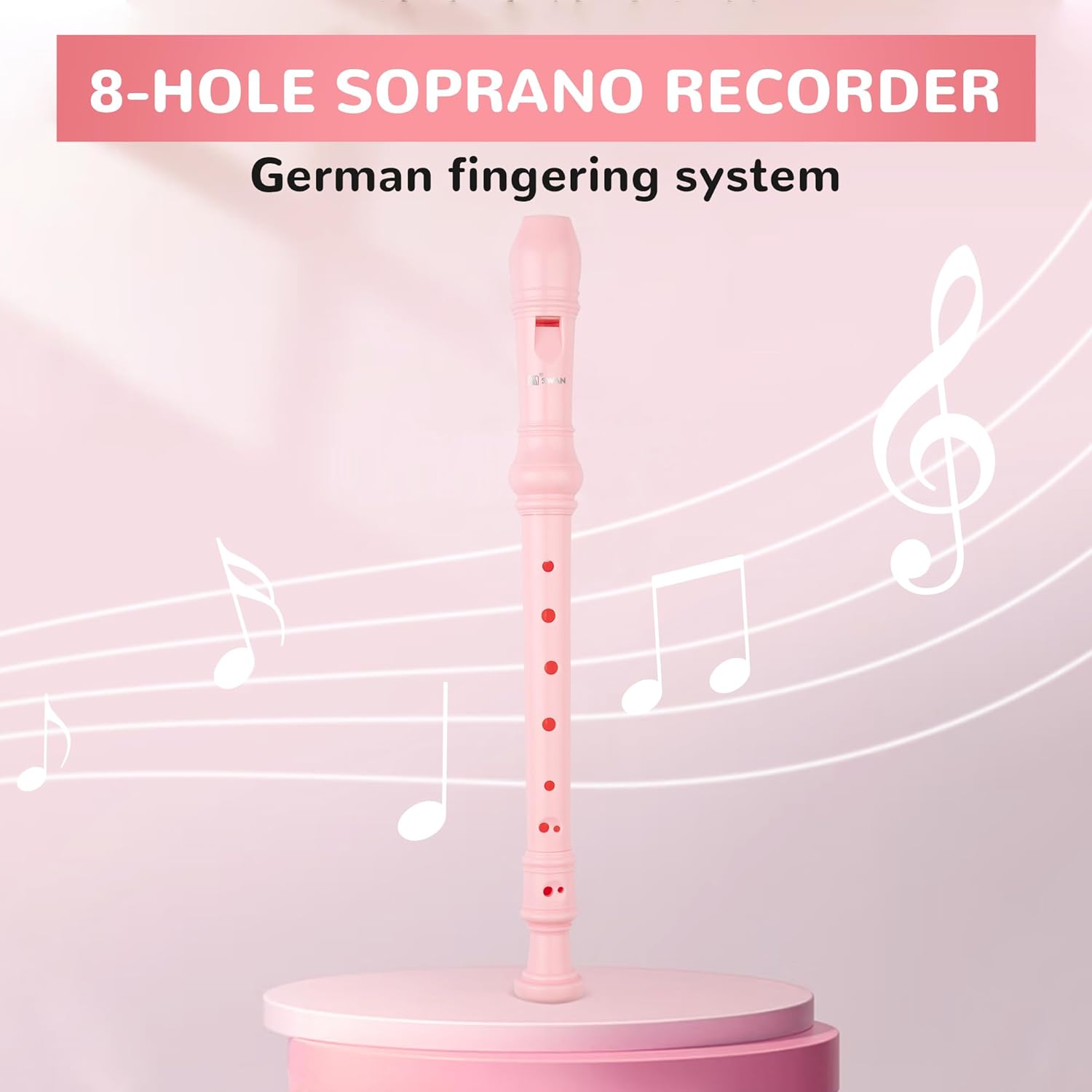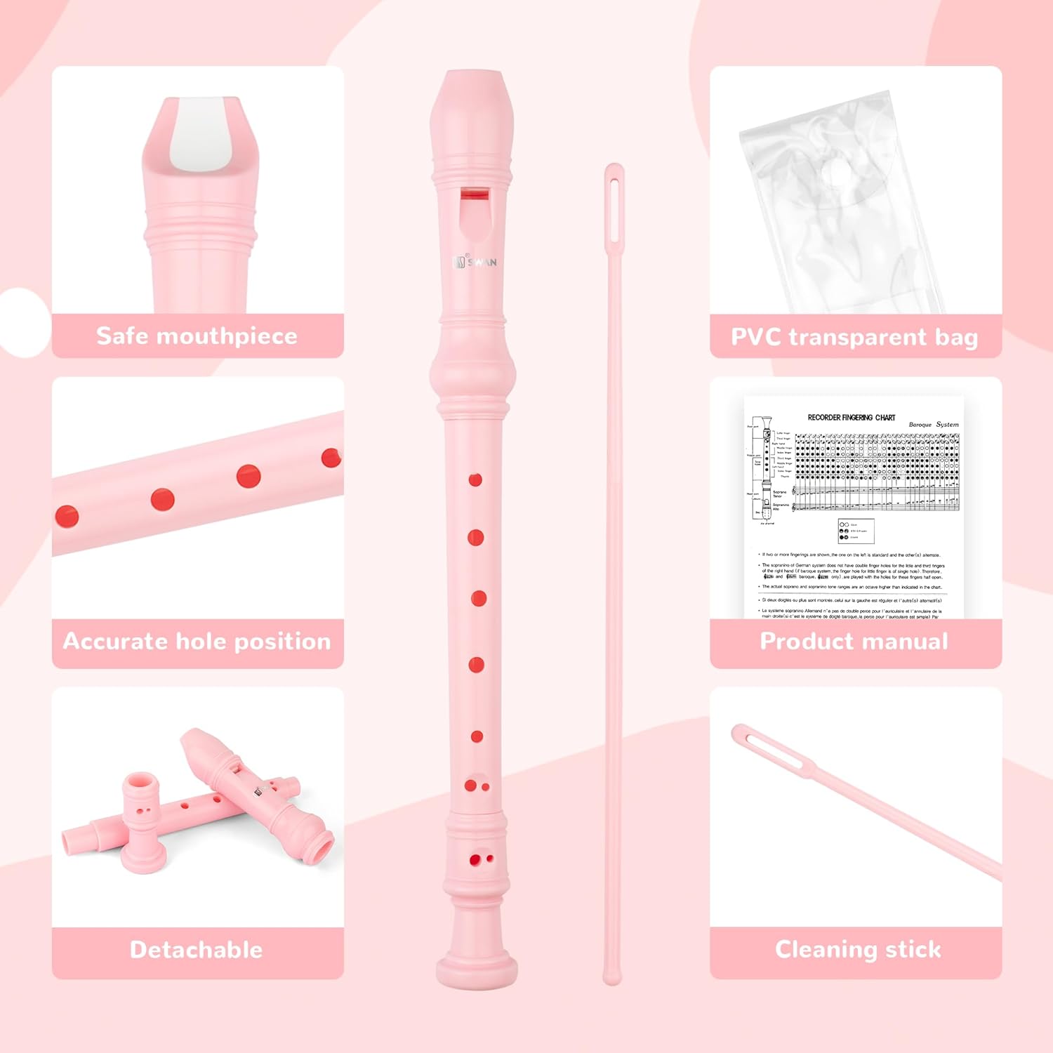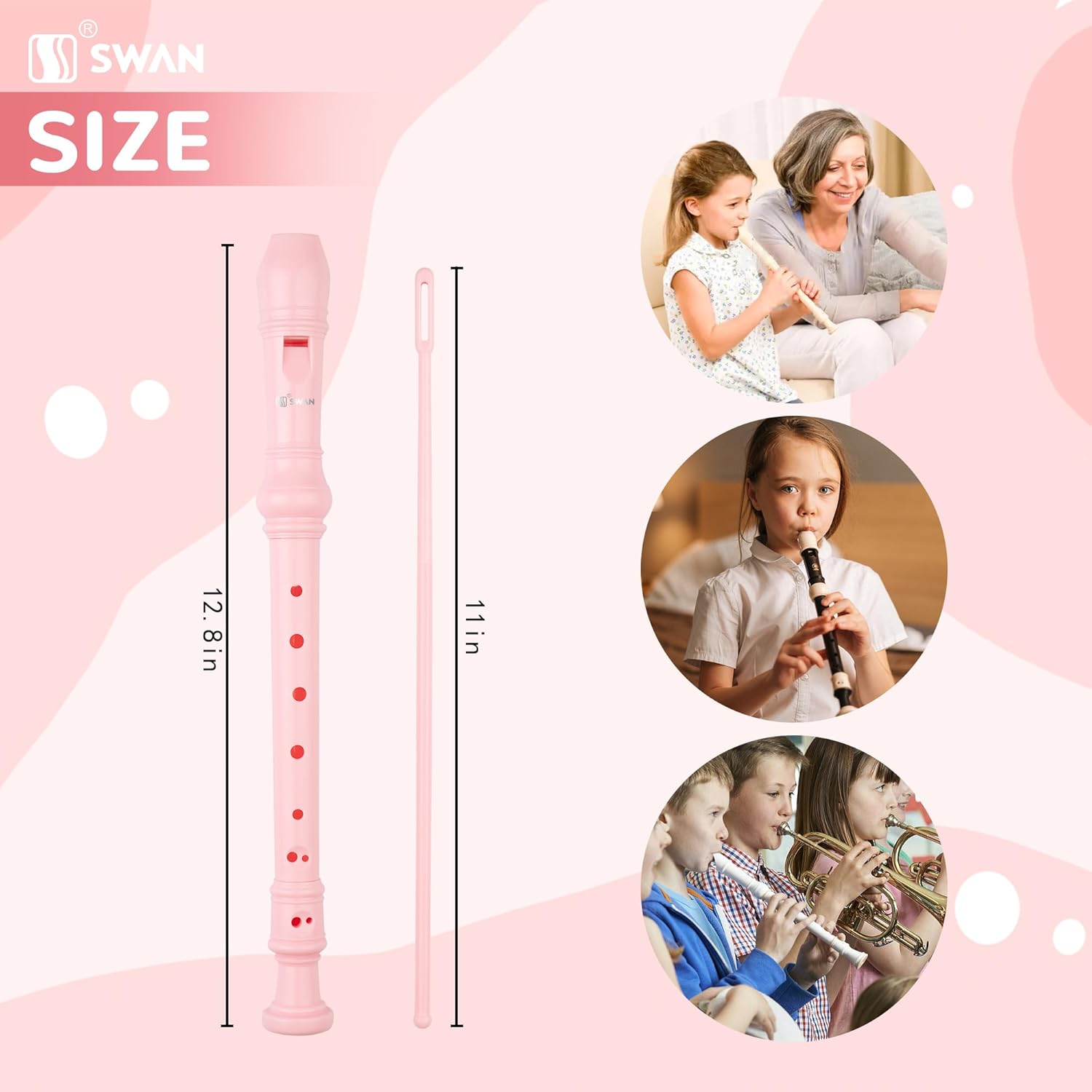 SWAN Soprano Recorder Instrument for Beginners Kids Student - German Fingering 8 Hole Flute Detachable 3pcs ABS Descant Recorders with Cleaning Rod and Fingering Chart, SW8K, Baby Pink