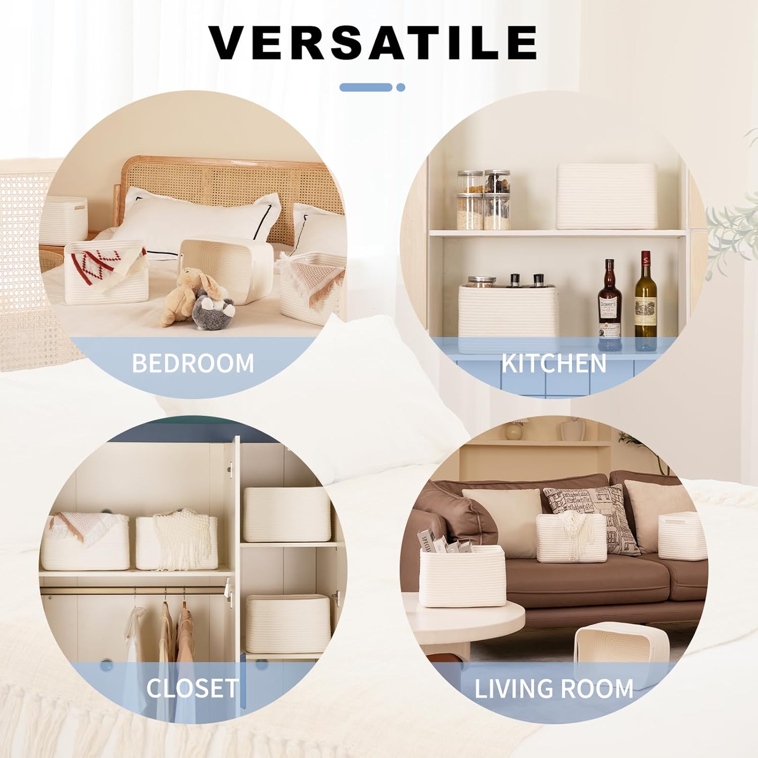 - Stylish and Elegant: SIXDOVE Cotton Rope Storage Basket. The woven design of these baskets adds a touch of rustic charm to any room decor, making them a perfect addition to your living room, bedroom, bathroom, or nursery. These cube rope storage baskets enhance any room or decor in your home
