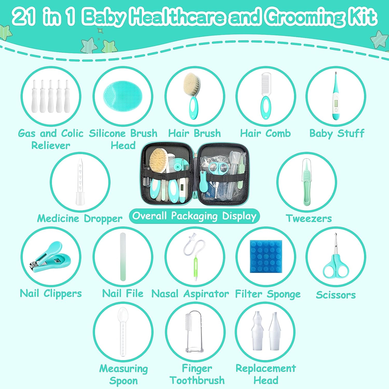 Baby Healthcare and Grooming Kit, 21 in 1 Portable Baby Essentials Kit with Gas Relief Hair Brush Comb Nasal Aspirator for Newborn Boys Girls (21 Kits-Green)