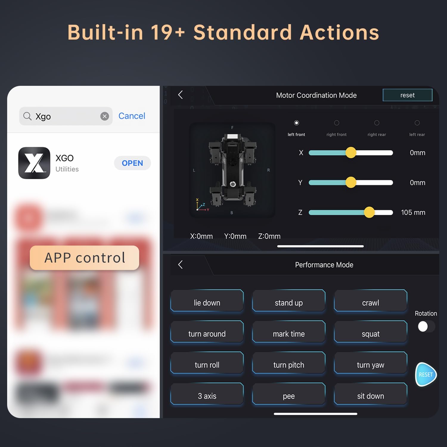 - 【19+ Build-in Actions】 The build-in actions are 19+ kinds such as to get down, shake hands, pee and look for food, it is easy to operate via APP ,or ELECFREAKS joystick and microbit makecode program.
