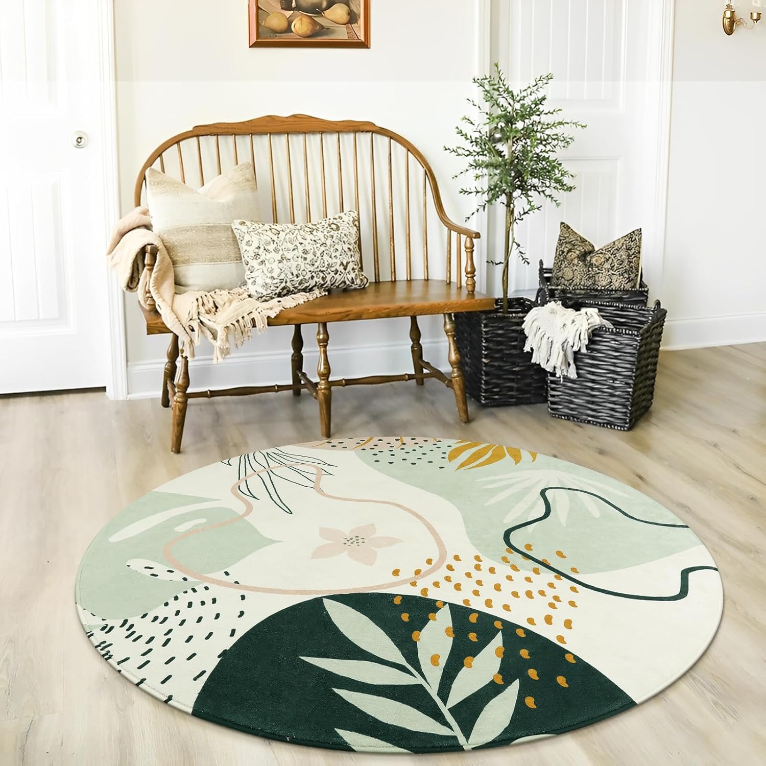 Lahome Boho Round Rugs - 4Ft Washable Non-Slip Small Round Area Rug Throw Soft Cute Round Nursery Rug Non-Shed Lightweight Bathroom Rug, Green Botanical Print Circle Rug for Bedroom Dorm Kids Room