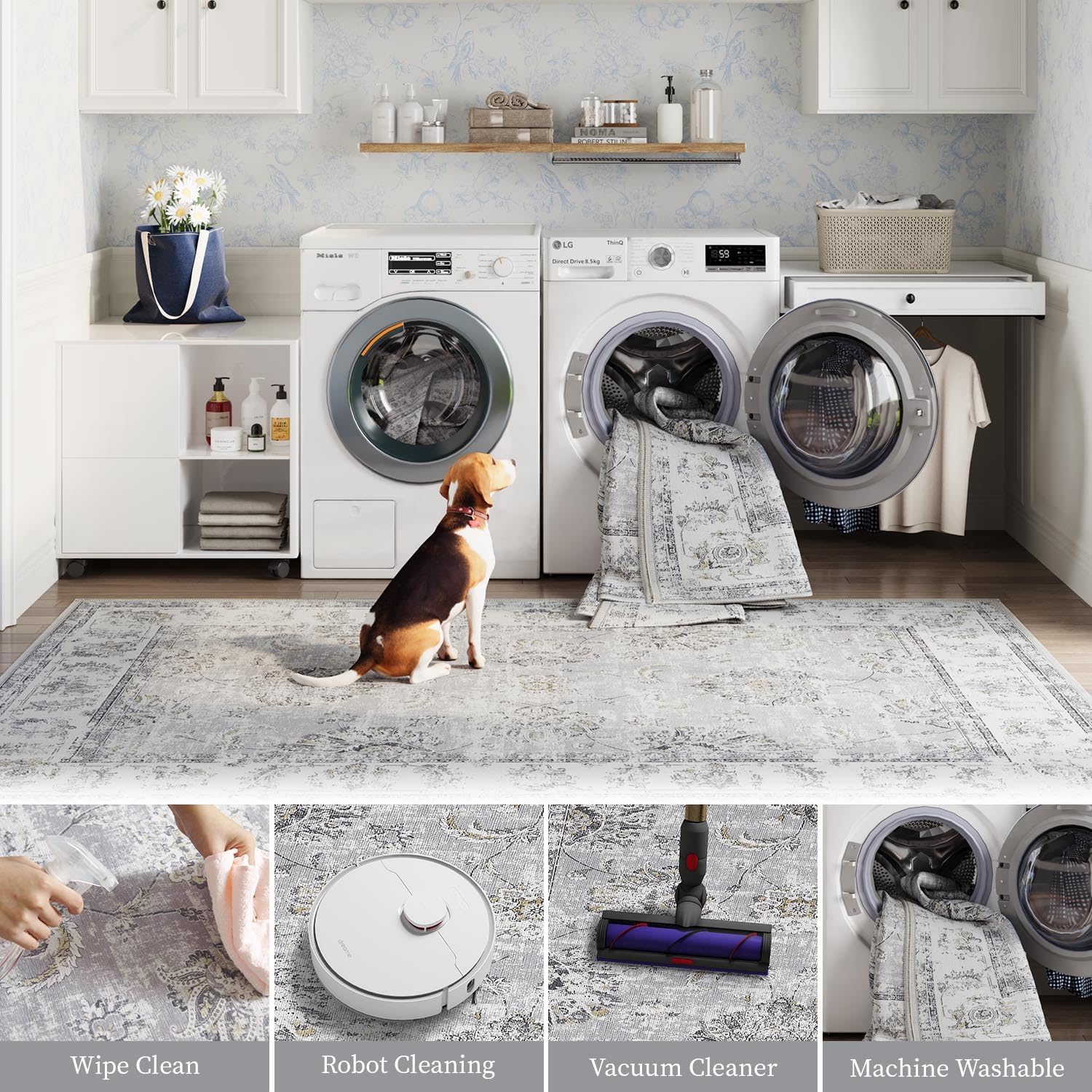 jinchan Round Rug 6ft Area Rugs Vintage Floral Distressed Design - Machine Washable Non-Slip Low-Pile Ultra-Thin Circle Rug for Entryway Bedside Living Room Dining Room Bedroom (6' Round,Grey)