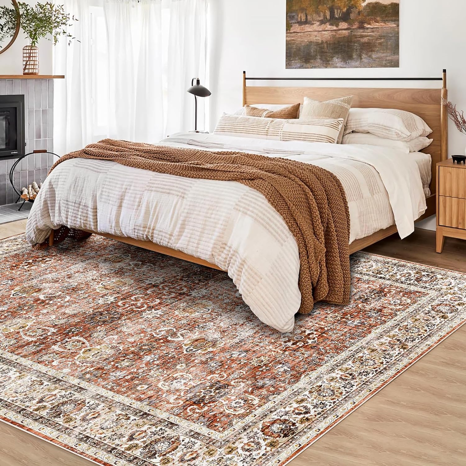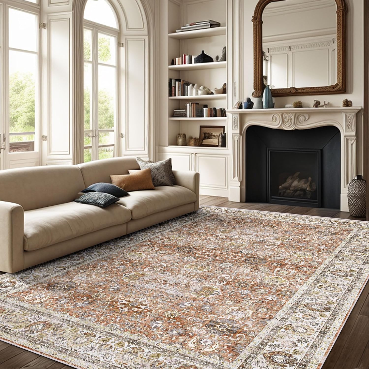 Deerly 6x9 Vintage Rugs for Dining Room, Washable Rugs Non Slip Large Area Rug for Living Room Bedroom Office, Floor Decoration Big Rug Mat Low-Pile Kid & Pet Friendly(Brick Red)